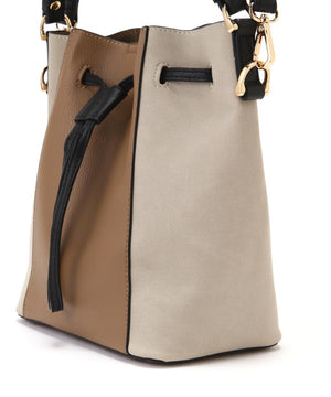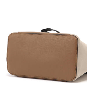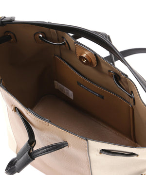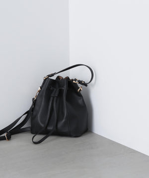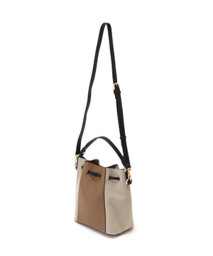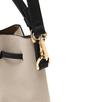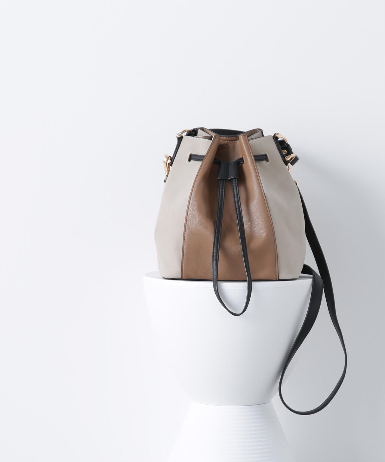 ユースフルなサイズ感がデイリーに使いやすいバケットタイプの巾着バッグ。手持ちハンドルに加えて、長さ調節できるショルダーストラップ付きです。ボディはパネル状のデザインで、黒はワンカラー、トライカラーベージュはヌバック調のフェイクレザーを使用したカラーブロッキングになっています。