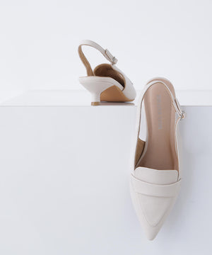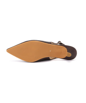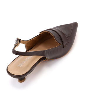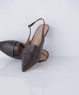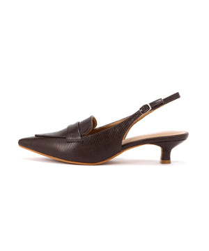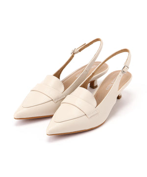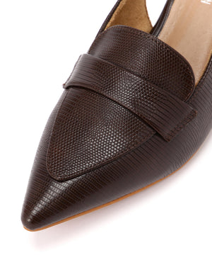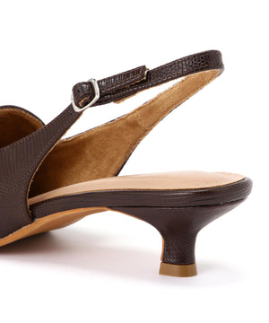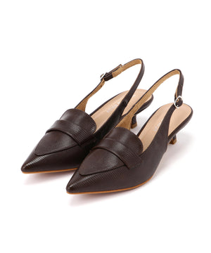 レディな雰囲気のスリングバックパンプスです。繊細なリザード調の型押しフェイクレザーを使いクラシックムードを演出。アッパーはローファータイプのデザインなので、きちんと感もあり、オフィスシーンのスタイリングにもマッチします。4センチヒールで高さを感じさせずスタイルアップを叶えてくれます。