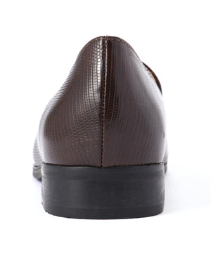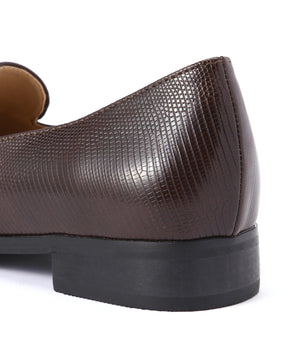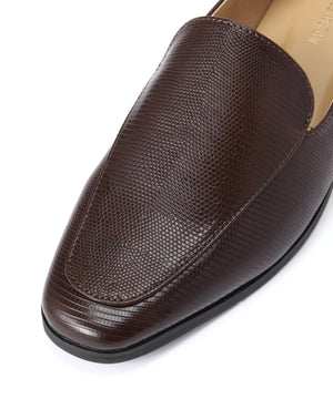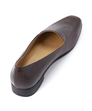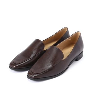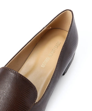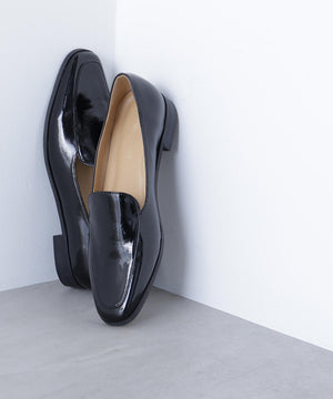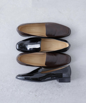 シンプルですっきりとしたアッパーと、程よいボリュームのある底まわりのコンビネーションが、オフィスシーンからデイリーに活躍するナローローファー。リザードの型押しできっちりした印象のブラウンと、程よい柔らかさのあるエナメル素材を使用したエフォートレスな黒の2色展開です。