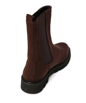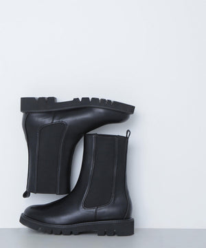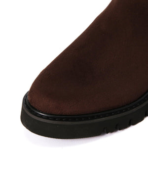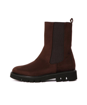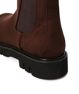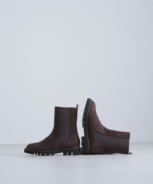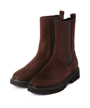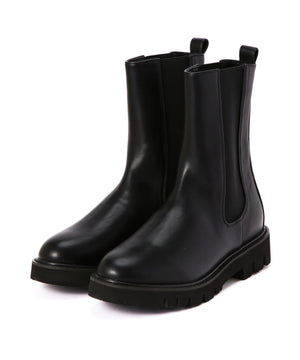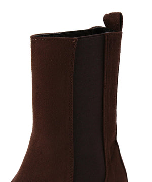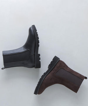 NBB定番人気アイテム!ボリュームのあるソールが今季トレンドのサイドゴアブーツ。どんなスタイリングでもバランスのとりやすいミドル丈なので、パンツは勿論、マーメイドスカートなどのフェミニンなアイテムとも相性抜群です。両サイドがゴア仕様なので着脱も簡単♪ソールは滑りにくく、溝が深いので雨天や足元の悪い日でも活躍します。定番ブラックのほかに、今シーズントレンドのスウェード素材を使用したダークブラウンカラーの2色展開です。