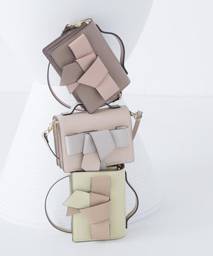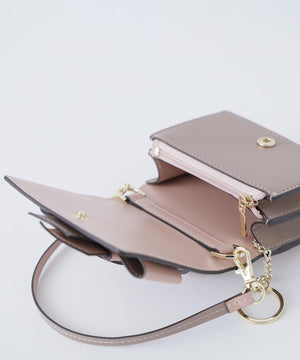 バイカラーのボウリボンをフラップにあしらった、大人かわいいフラグメントケースです。マチ幅がしっかりありハンドバッグのように細部まで工夫されたデザインです。カードや運転免許証、小銭などが入るファスナーポケット付き。中央キーリング付きポケットは、マチ幅と厚みもしっかりあるので車や家の鍵をまとめて入れられます。背面には、ICカードなどを収納したままタッチが出来るポケット付き。また、フラップのトップには短い持ち手とナスカン付きのストラップが付いているので、バッグインでもバッグチャームとしても大活躍してくれます。これ一つとスマートフォンでどこへでもお出かけできますよ♪ホリデーシーズンのギフトにもおすすめです。