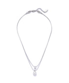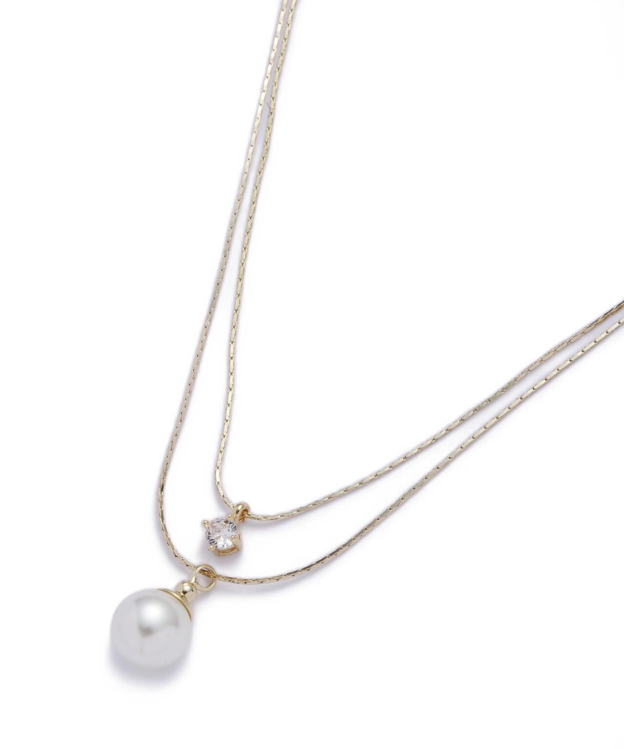 2連のチェーンそれぞれにパール調パーツとストーンをあしらった定番のプチネックレス。主張しすぎないシンプルデザインでオフィスシーンにもおすすめです。取り外し可能なため、それぞれ単品としても活躍します。