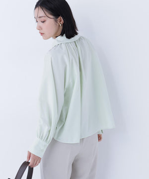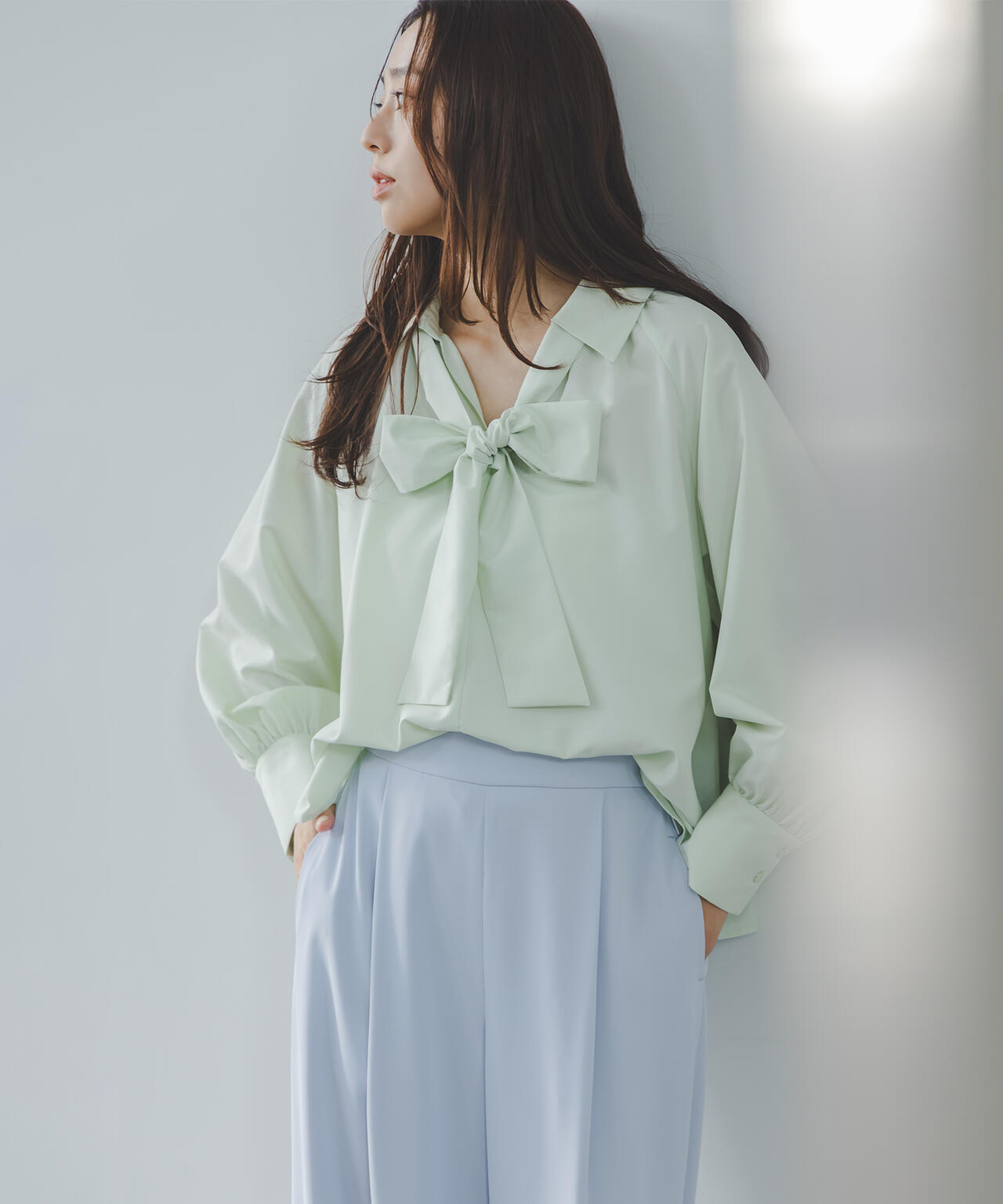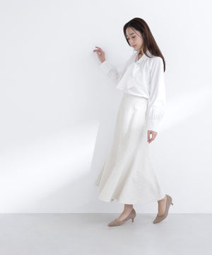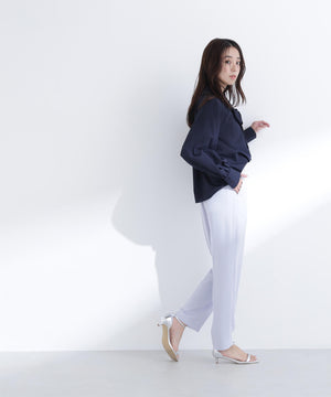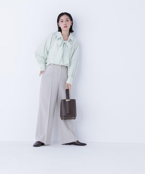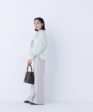 顔まわりを華やかに見せてくれるリボンタイブラウス。抜け感のあるスキッパーネックとリボンタイを合わせたデザインです。自由に結べるリボンタイデザインは、フロントで大きくリボン結びをするのがオススメ。一枚でもジャケットインでも映えます。合わせるボトムス次第でオンオフ問わず、幅広いコーディネートに活躍してくれます。