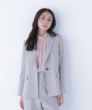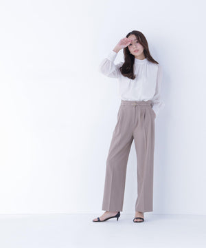 NBB人気のブラウスに春カラーが登場!ハイネックの後ろは、ゴールドカラー釦を2つ並べて品のある雰囲気を出し、いつもより涙開きから見える肌見せ具合を抑えています。袖に裏地が付いていないので透け感を楽しめます。ウエストインすると、ボリュームのあるブラウジングのシルエットになります。