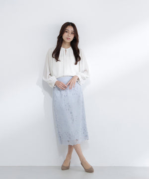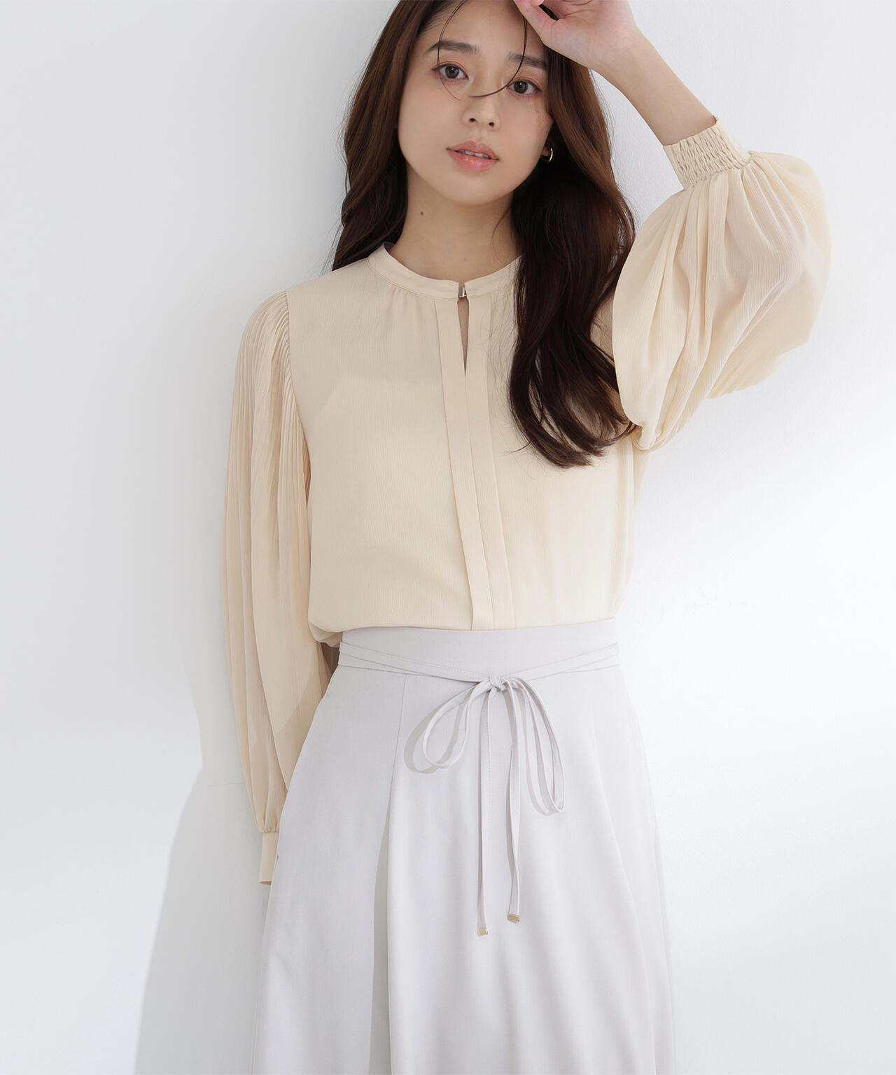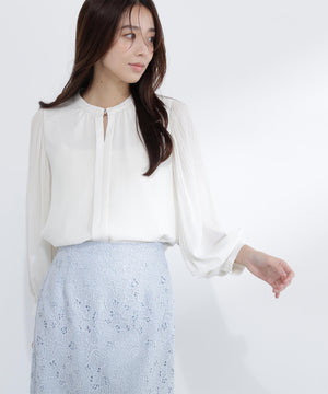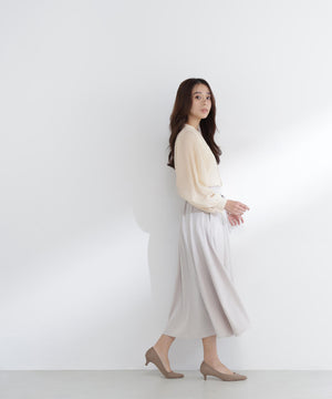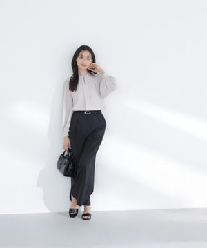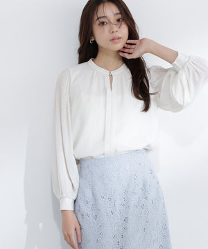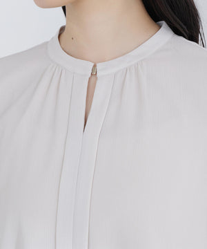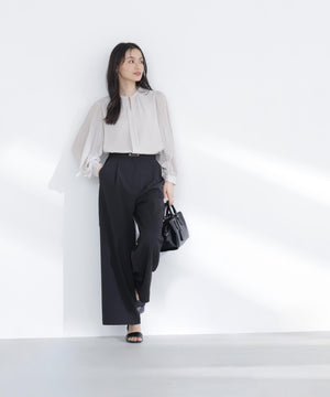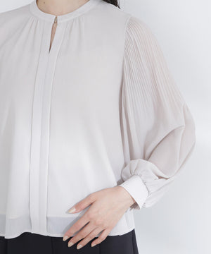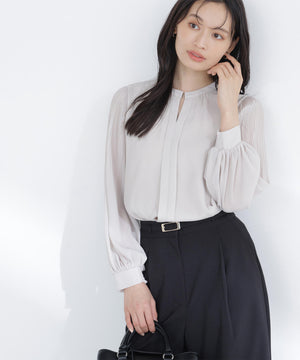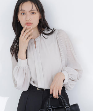 軽やかな楊柳生地に上品な光沢のメタルポイントを首元に添えた華やかなブラウス。袖のプリーツが動くたびに美しく揺れ、腕まわりをエレガントに演出してくれます。縦シボのある素材は体のラインをすっきり見せながらも、程よい透け感で大人の抜け感をプラス。スカートでもパンツでも相性がよく、着まわし力は抜群です。