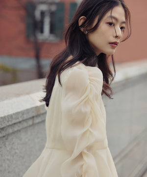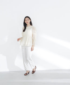 毎年人気のブラウスが春カラーになって再登場!早い時期から着られる袖丈にし、袖山に入れたギャザーのボリューム感を調節して、着映え感と着やすさを両立したデザインです。ONにもOFFスタイルにも使いやすい、品のあるペプラムシルエットを演出。ファスナー開きなのですっきりとしたシルエットで着ていただけます。