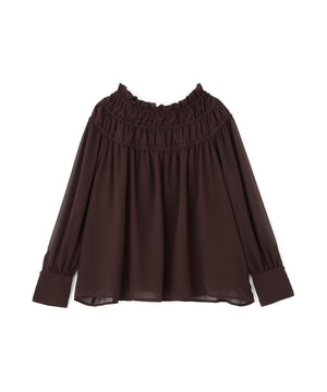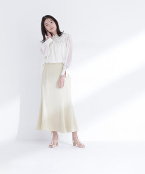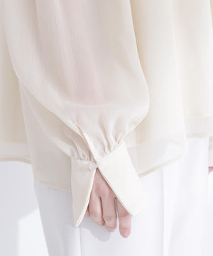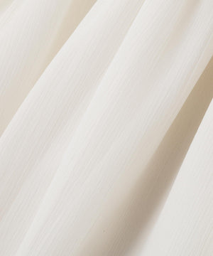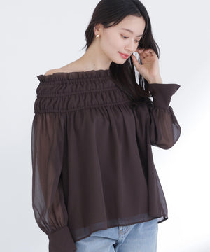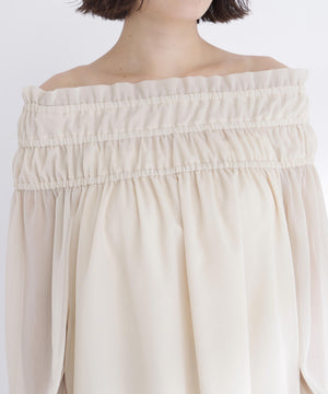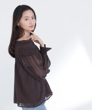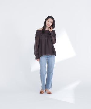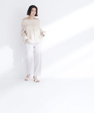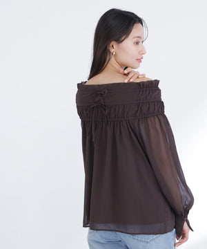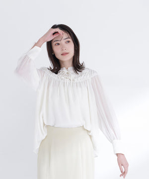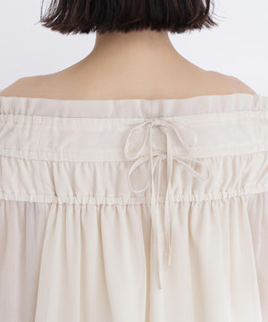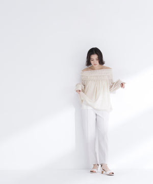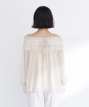 楊柳素材を使用した軽やかな風合いのブラウス。前後2WAYで着用でき、オフショルダーとしても楽しめるデザインです。襟ぐりはリボンでフィット感の調節が可能。程よい透け感のある素材で、女性らしい抜け感を演出してくれます。