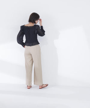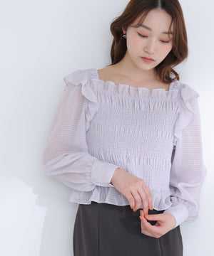 シアー感のあるチェック素材を使用したフェミニンな印象のトップス。細かく華奢なチェック柄が、繊細で上品な雰囲気を演出します。身頃のシャーリングデザインとコンパクトなシルエットで、着映えとスタイルアップが叶います。バックスタイルは華奢なリボン付きで、後ろ姿も印象的に見せてくれます。