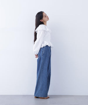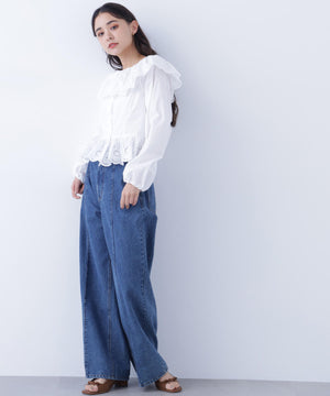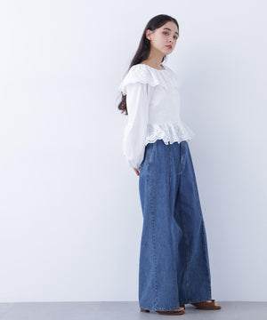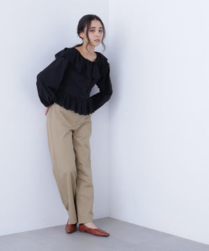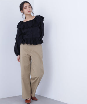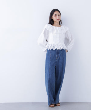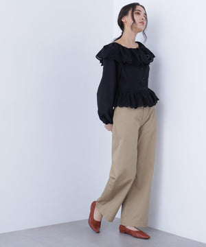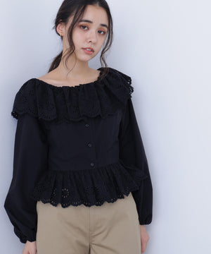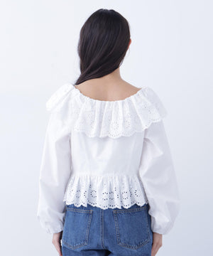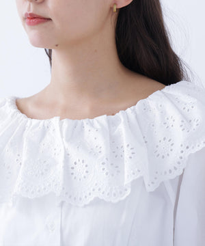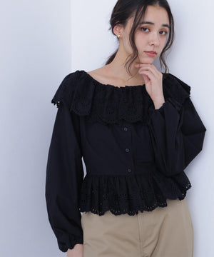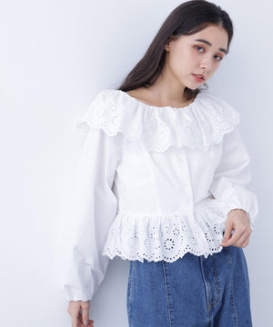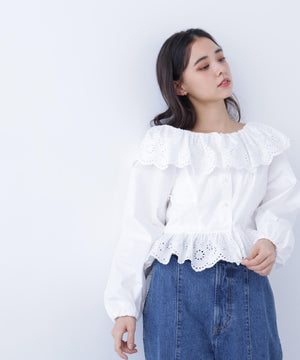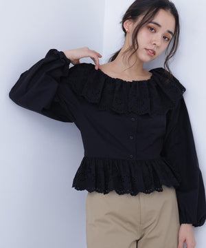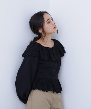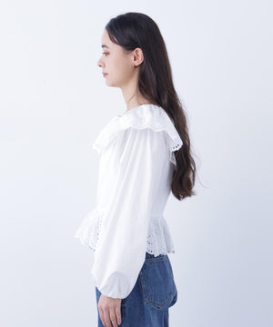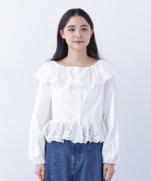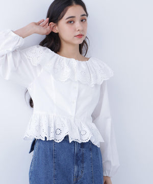 前後2WAYで着られる着回し力の高い、コンパクトなペプラムブラウス。大きな襟にあしらった繊細な刺しゅうが華やかに映えるデザインです。軽やかなコットン素材を使用しており、春らしい爽やかな印象に見せてくれます。