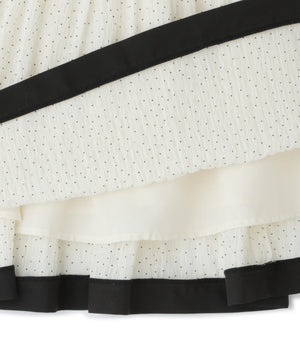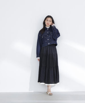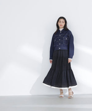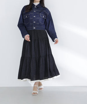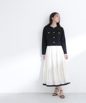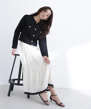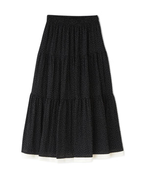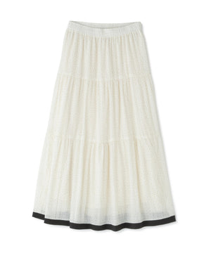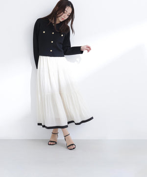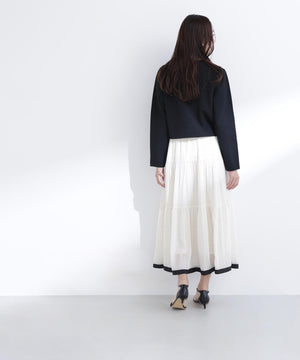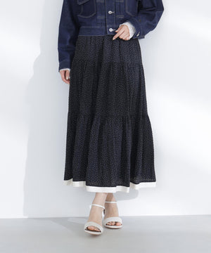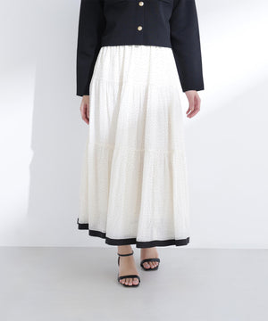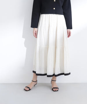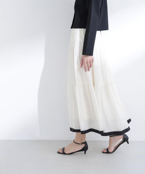 上品かつ華やかなティアードスカート。軽やかな素材を使用しているので、歩くたびにふわりと広がる女性らしいシルエットを演出します。存在感のあるバイカラー配色がコーディネートにアクセントをプラス。シンプルなトップスと合わせるだけでコーディネートがおしゃれに決まります。