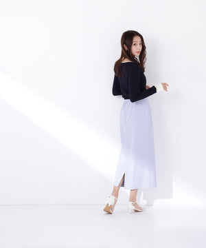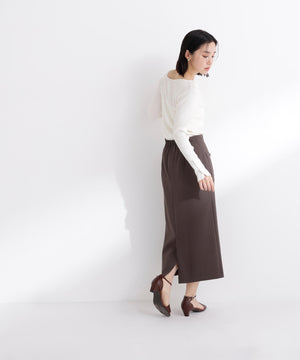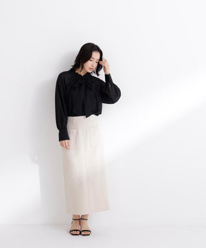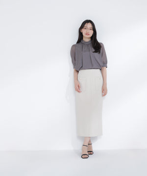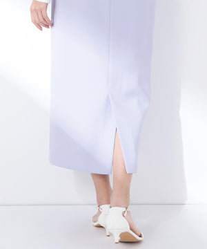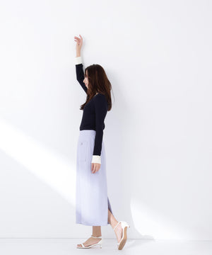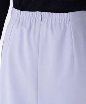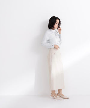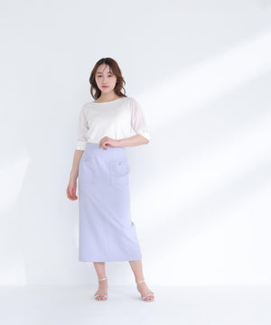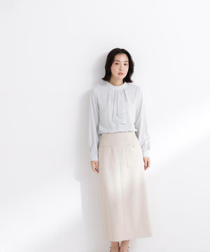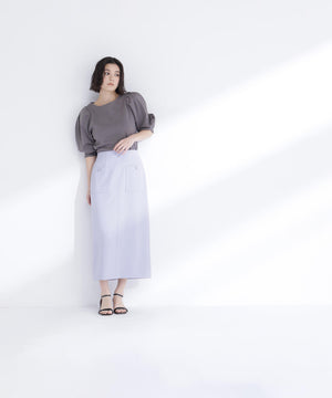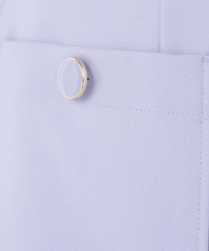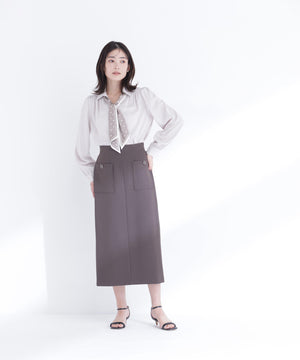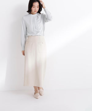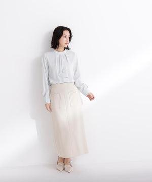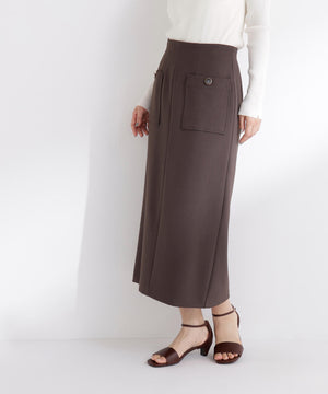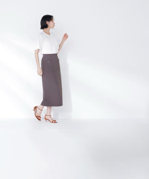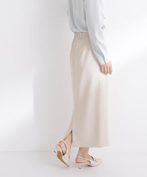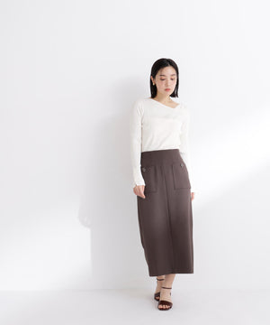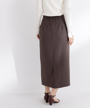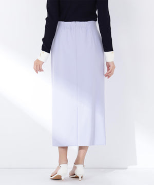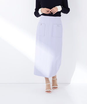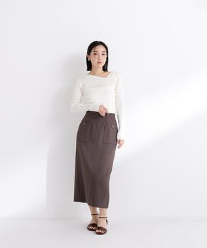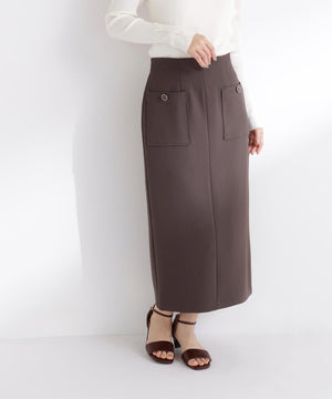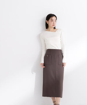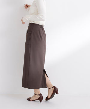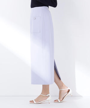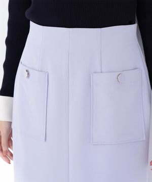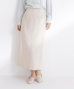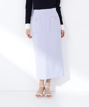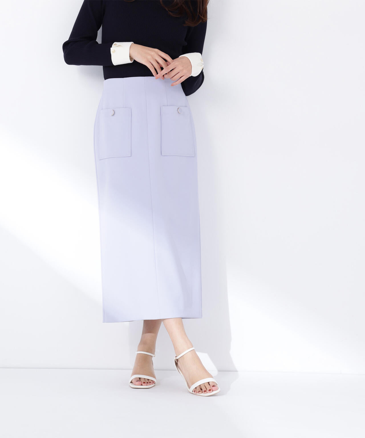 アウトポケットがポイントのナロースカート。アウトポケットに付けたゴールドカラーの縁取り釦がアクセントになり、上品でキレイめな印象を演出。程よいハイウエストと後ろウエストはゴム仕様で、ストレスフリーなはき心地です。後ろ裾のベンツで足さばきも良く、オフィスシーンにもおすすめです。