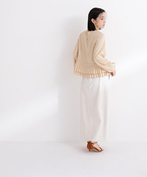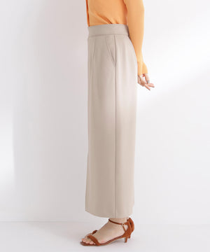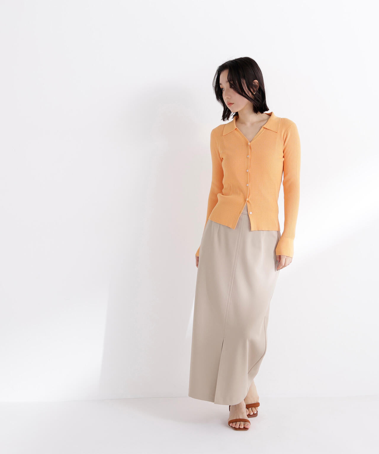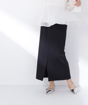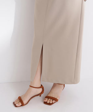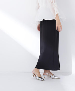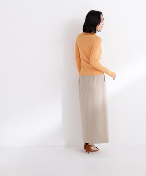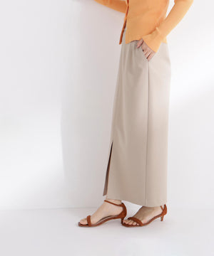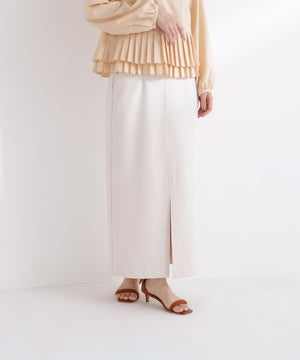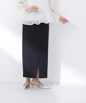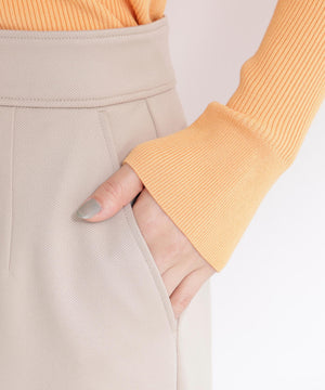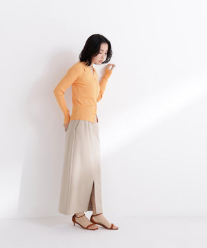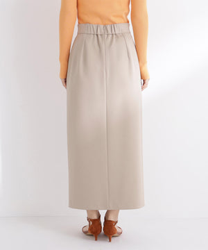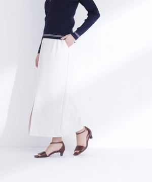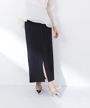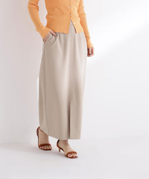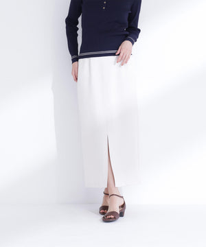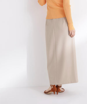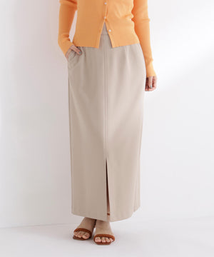 NBB定番人気のストレッチカルゼシリーズが素材を変えて再登場!程よく肉感があるので体のラインを拾いにくく、カットソー素材で伸縮性も抜群、ストレスフリーな着心地です。すっきりとしたナローシルエットを演出し、フロントスリット入りで抜け感と足さばきも良い一枚。便利なスラッシュポケット付き。後ろウエストはゴム仕様でラクなはき心地です。