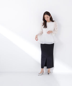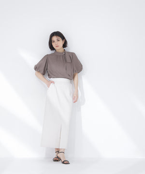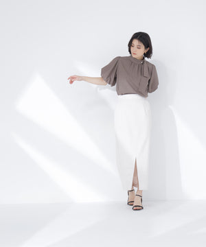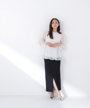 ストレッチ性の高いカットソー素材を使用。体のラインを拾いにくい肉感にクリアなタッチと目面でキレイめな印象の素材感です。
