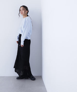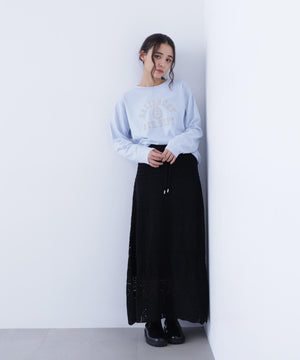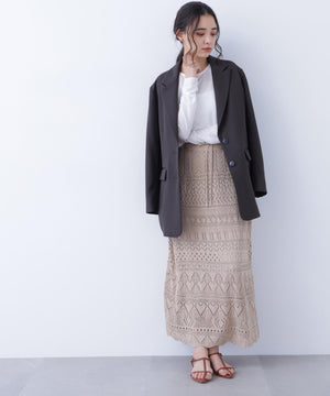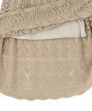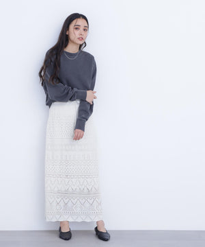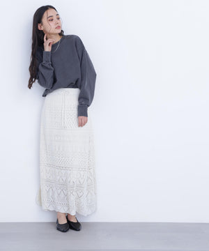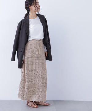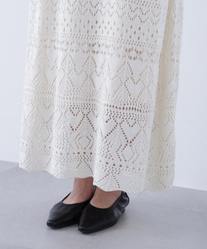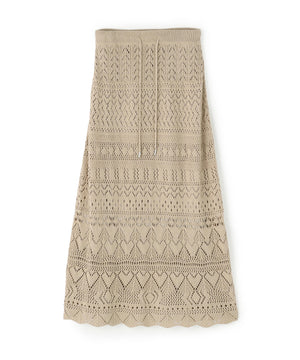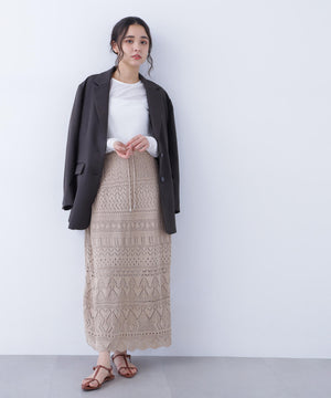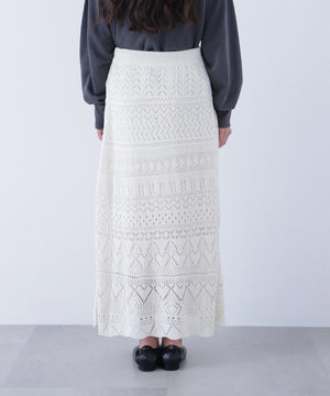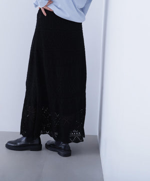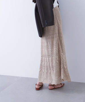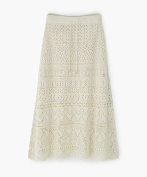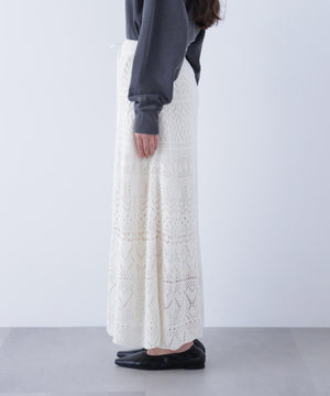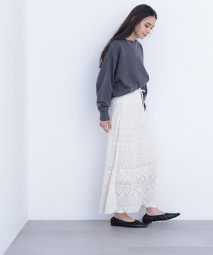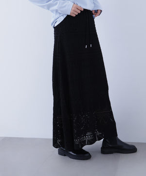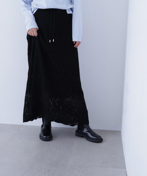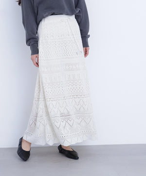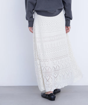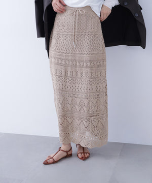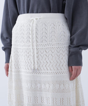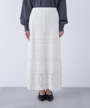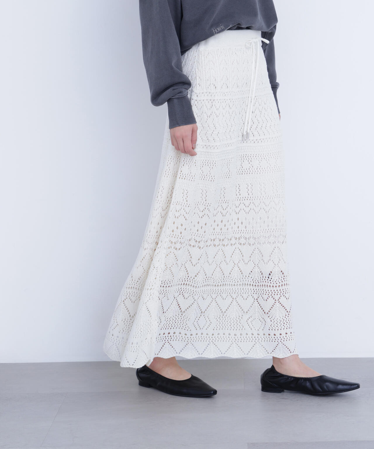 ナチュラルでリラックス感のある、カジュアルなかぎ針ニットスカート。ざっくりとした編地が程よく抜け感を出し、シンプルなトップスと合わせるだけで季節のスタイルを叶えます。ペチコートを取り外し、デニムやパンツとのレイヤードスタイルもおすすめ。ウエストは総ゴム仕様でストレスフリーなはき心地です。