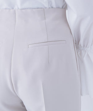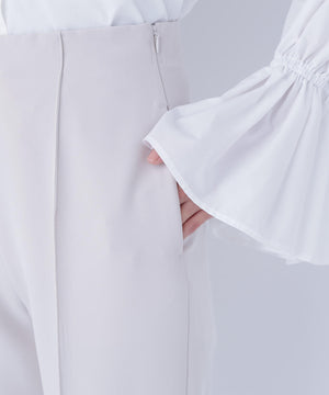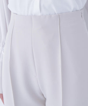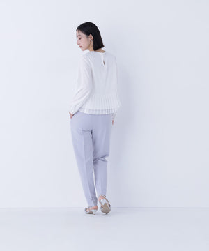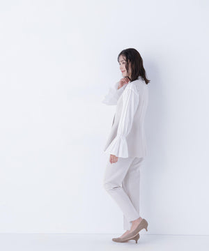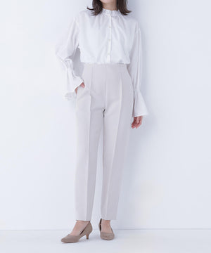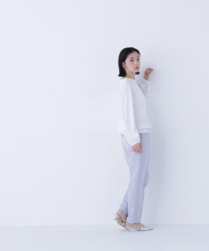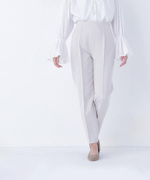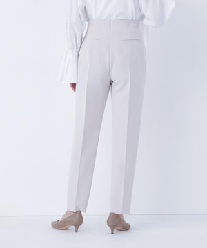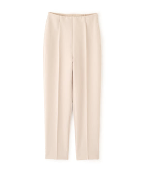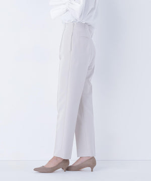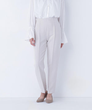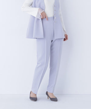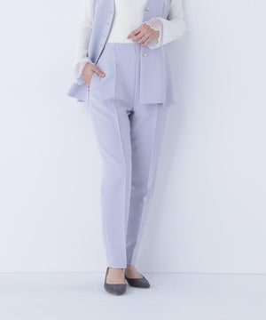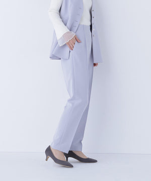 きちんと感のある素材を使用したオケージョンシーズンにぴったりなテーパードパンツ。センターラインのピンタックが、すっきりとスタイルよく見せてくれます。どんなトップスとも合わせやすく、着回し力はバツグン。同素材のジレとのセットアップもおすすめです。
