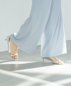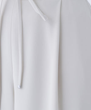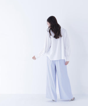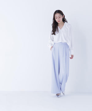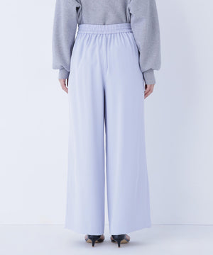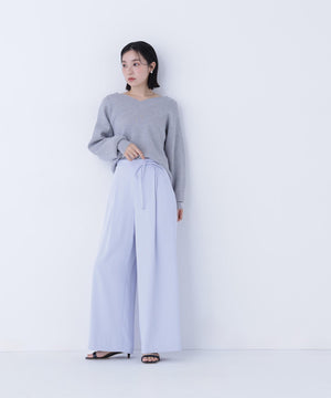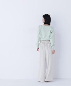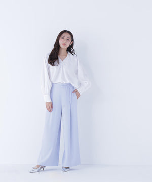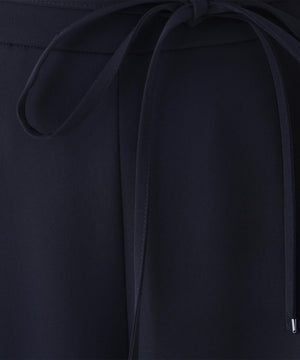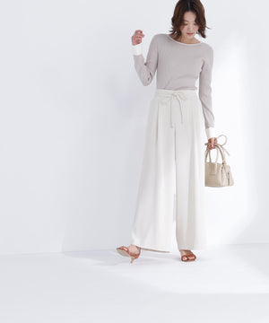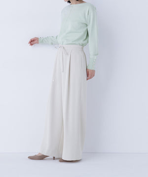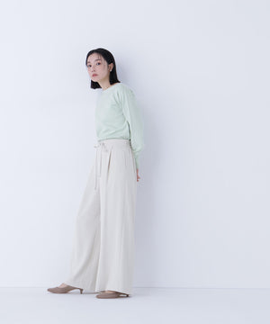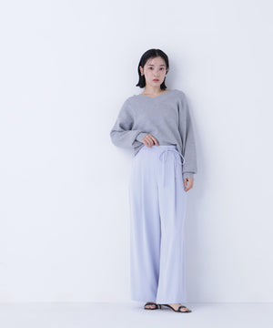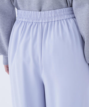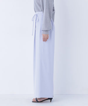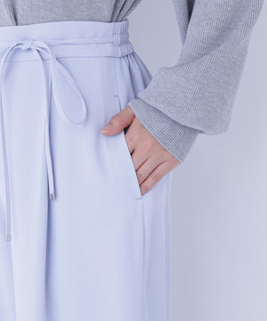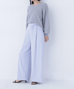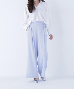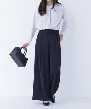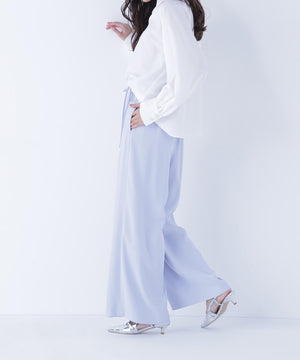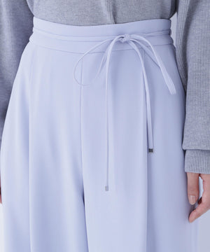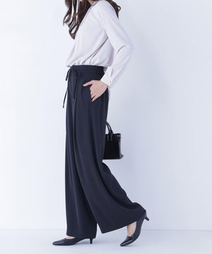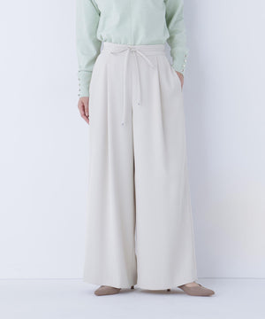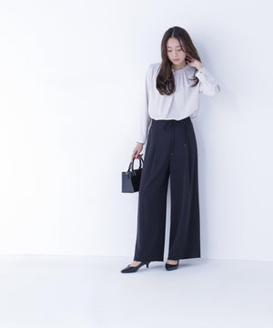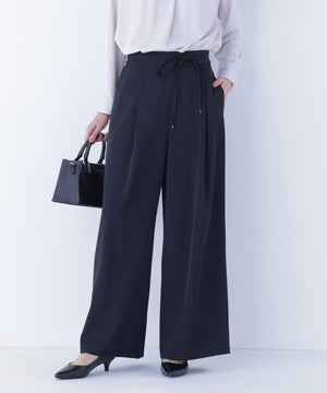 落ち感のある素材を使いリラックスしたはき心地のパンツ。ゆったりとしたサイズ感で体型カバーしながら、ウエストリボンでサイズ調節できます。キレイめな素材を使用しているので、リラックスしたはき心地ときちんと感を両立したデザインです。