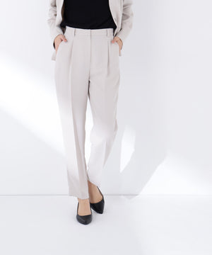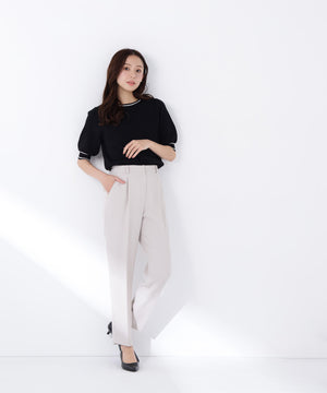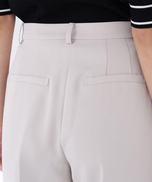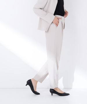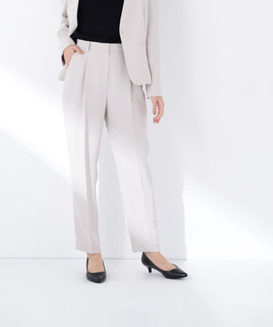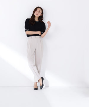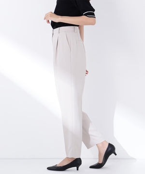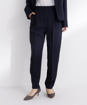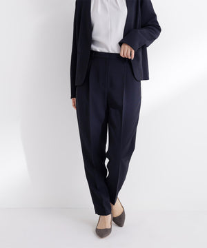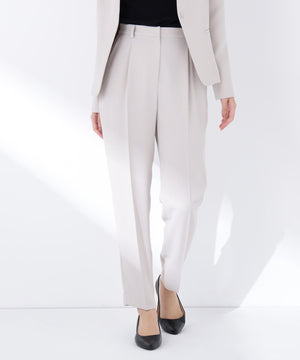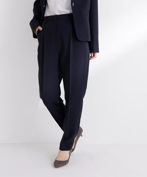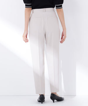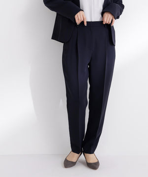 ストレッチ性のある素材で動きやすく、長時間の着用も快適なはき心地の上品テーパードパンツ。センタープレスが脚のラインをキレイに見せながらきちんと感を演出します。フロントのワンタックで腰まわりに程よいゆとりをプラス。洗練されたシルエットがオンスタイルに活躍してくれます。同素材のノーカラージャケットとのセットアップもおすすめです。