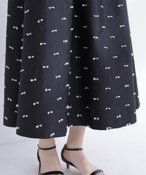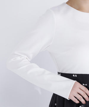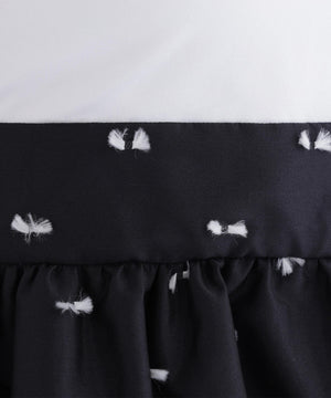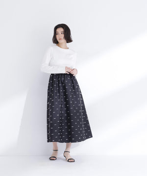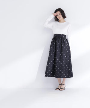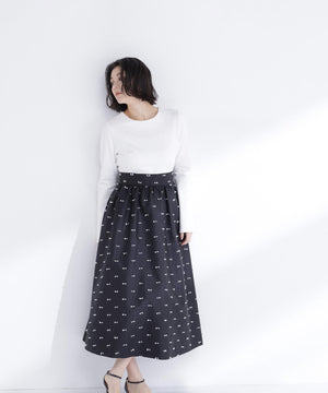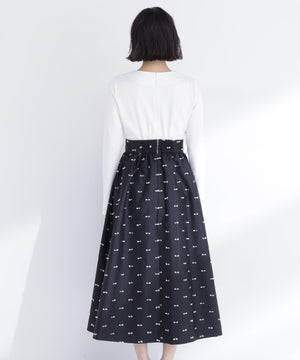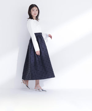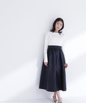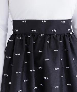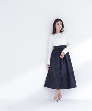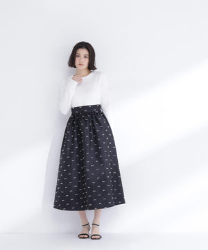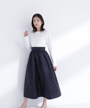 トップスはしっかりとしたカットソー、スカートはハリのあるタフタ素材にリボンジャガード柄を入れた素材です。