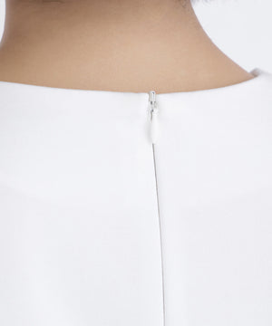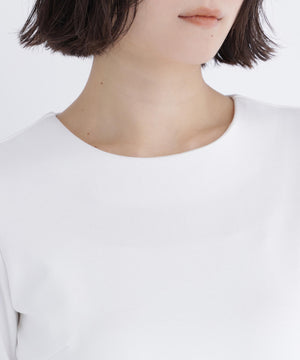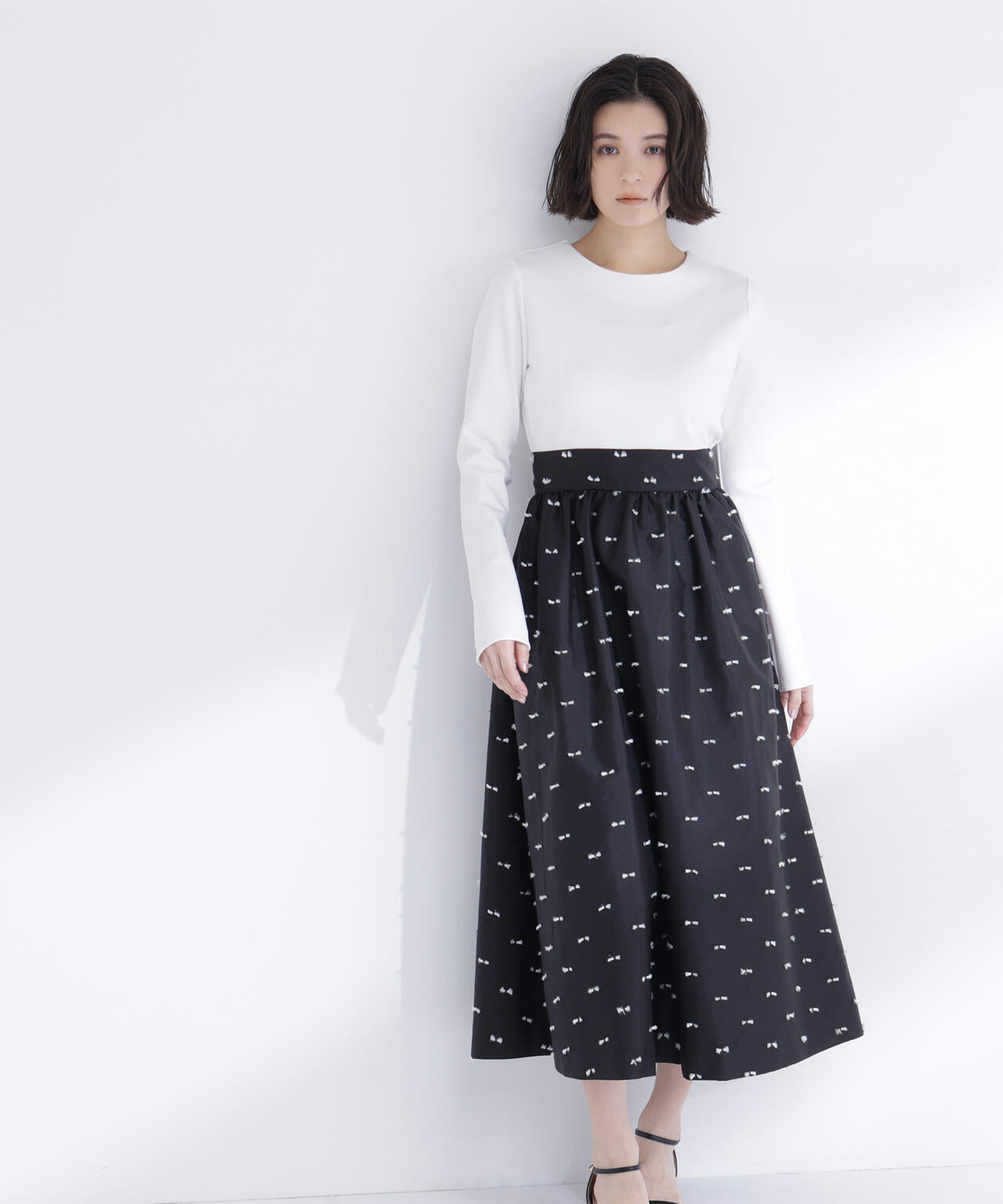 異素材を組み合わせたデザイン性と着やすさを両立したドッキングワンピース。トップスはキレイめなスムースカットソーで滑らかな着心地です。スカート部分はリボン柄ジャガード布帛を使用しており、上品で華やかな印象に見せてくれます。