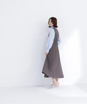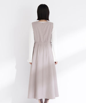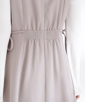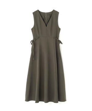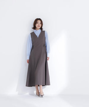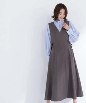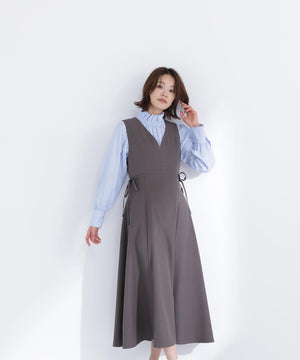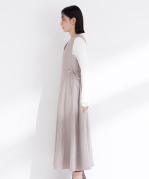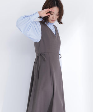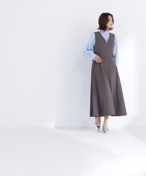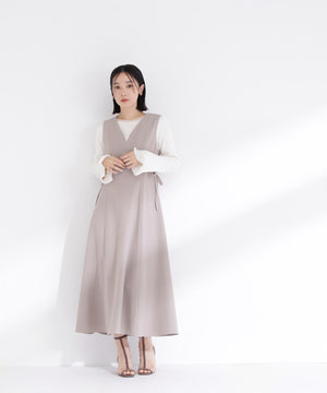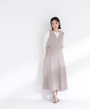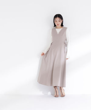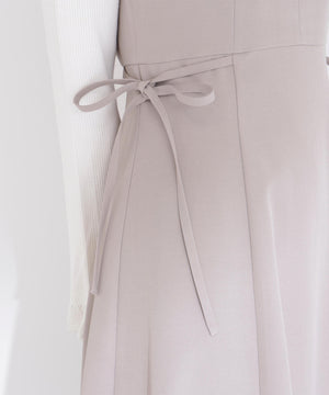 ウエストサイドの細リボンが華奢なアクセントのジャンスカ。胸元のカーブラインが柔らかい印象に見せてくれます。中はブラウスやニットプルオーバー合わせもおすすめ。フィット&フレアシルエットで幅広い体型に合わせやすく、ウエスト位置が高めなのでスタイルアップも叶えます。