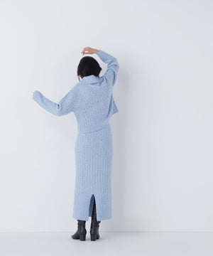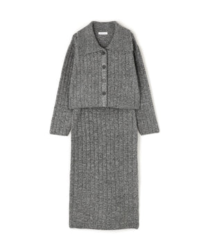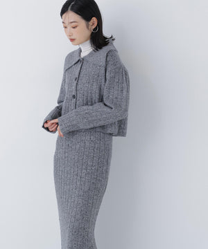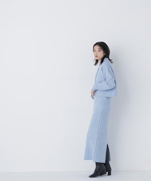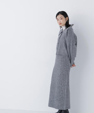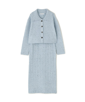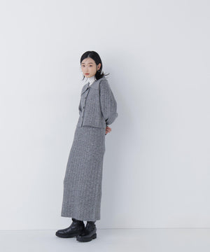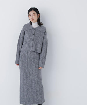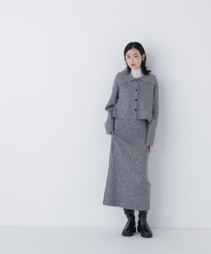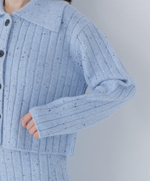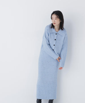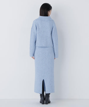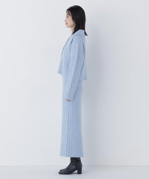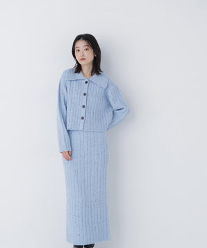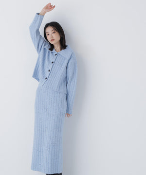 きらっと光るスパンコール糸とネップ糸を引き揃えた、華やかな素材感のニットセットアップ。トップスは大きめの襟と配色スコッチ釦を効かせており、セットアップでも一枚着でも着回せます。前を閉じてプルオーバーとしても、カーディガンとして羽織る着こなしもおすすめ。スカートはすっきりとしたナローシルエットで、後ろにはスリットを入れて足さばきの良さと抜け感もプラスしています。