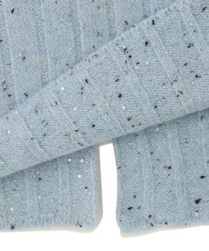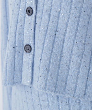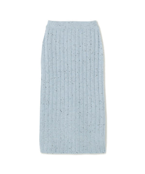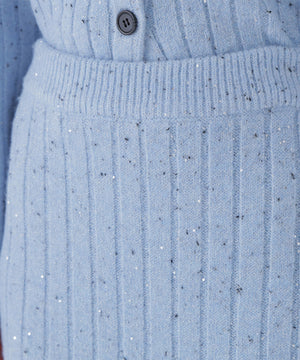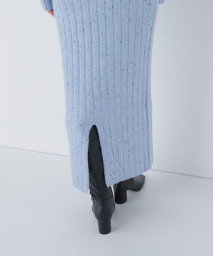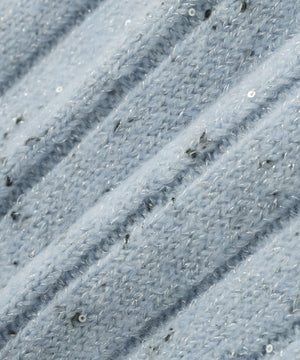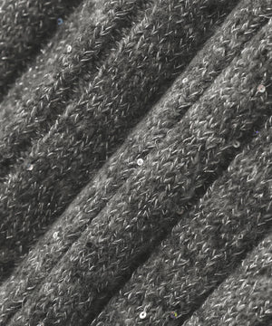きらっと光るスパンコール糸とネップヤーンを引き揃えてリブ編みで編み立てました。柔らかく、体のラインを拾いにくい肉感です。スカートはウエストゴム仕様です。
