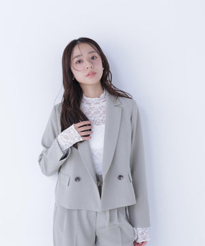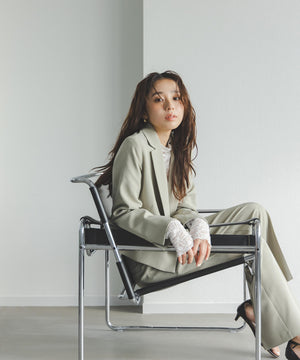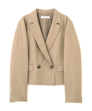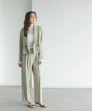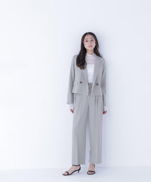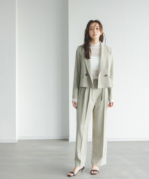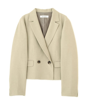フロントはダブルボタン仕様でフラップポケットが程よいアクセントとなり、きちんと感をプラスするジャケット。ショート丈がウエスト位置を高く見せ、スタイルアップ効果も期待できます。袖口にはスリットが入り、ロールアップすると軽やかに着こなせます。同シリーズのパンツと合わせれば、洗練されたセットアップスタイルが完成します。