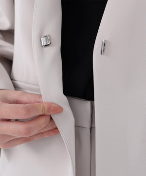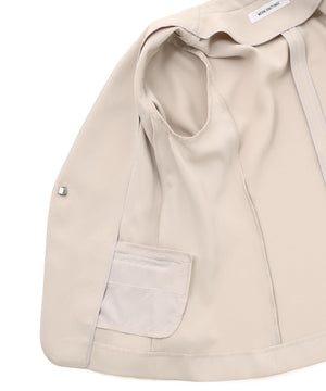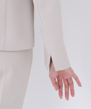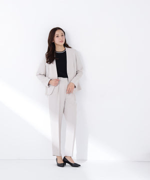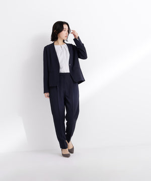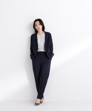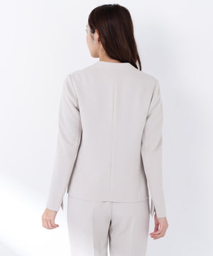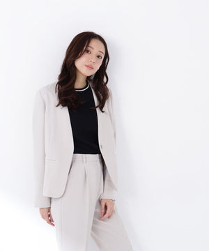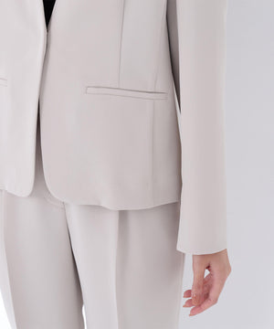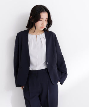 ストレッチの効いた素材で動きやすく、長時間の着用も快適な着心地のノーカラージャケット。すっきりとしたネックラインが顔まわりをシャープに見せ、洗練された印象を演出。コンパクトシルエットで、フロントはミニマルなホック留め仕様です。袖口にはスリットが入り、ロールアップすると軽やかな着こなしを楽しめます。同素材のテーパードパンツとのセットアップもおすすめです。