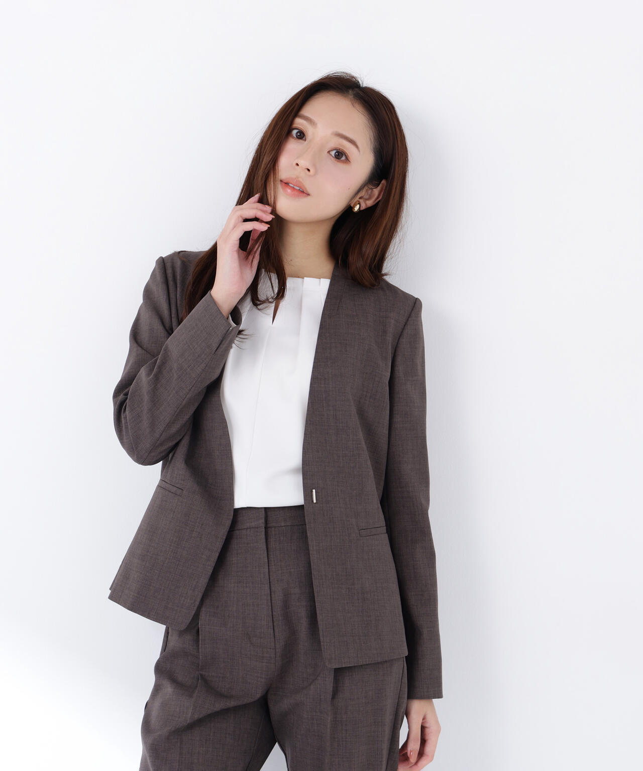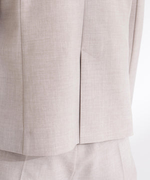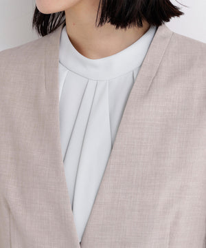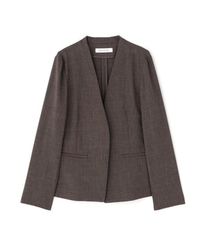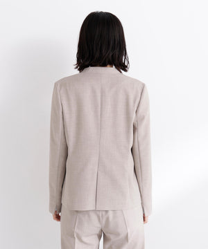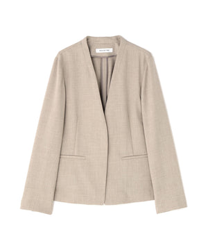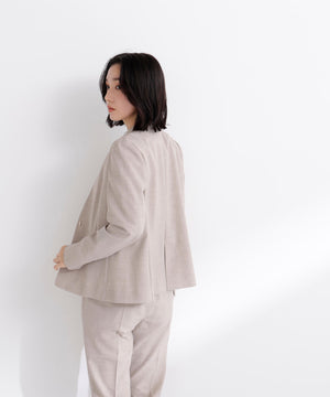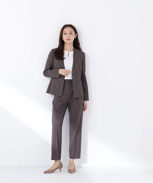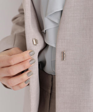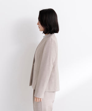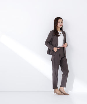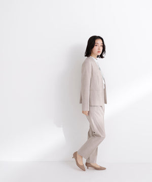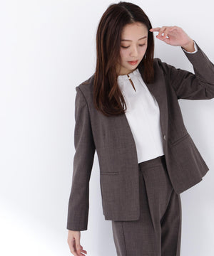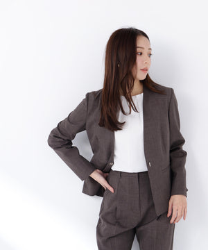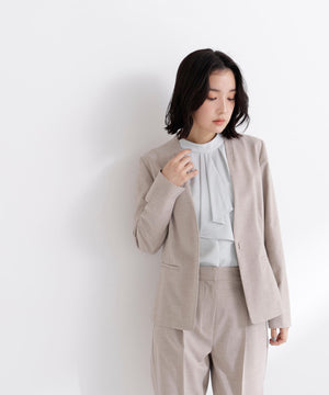 少し立ち上がったネックラインが顔まわりをすっきりと見せてくれる、上品な印象のノーカラージャケット。フロントは金属ホック仕様で、ミニマルかつ洗練されたデザインがポイント。袖口はスリット入りでさりげない抜け感があり、袖口を折り返しても着られます。同素材のパンツと合わせれば、通勤からキレイめシーンまで活躍するセットアップスタイルが完成します。