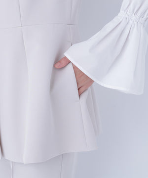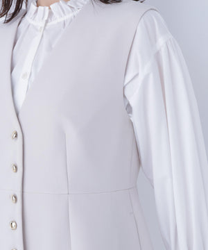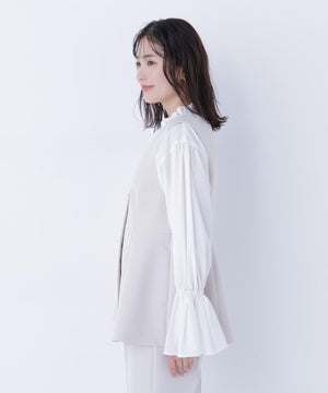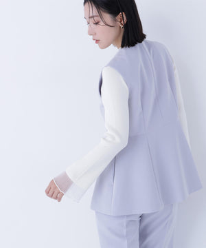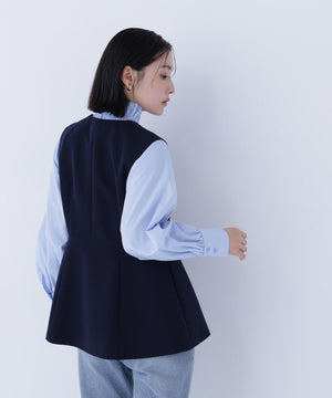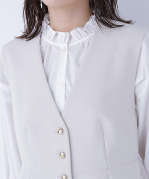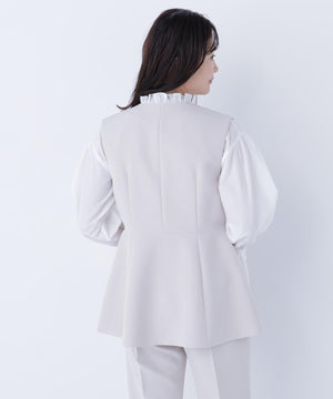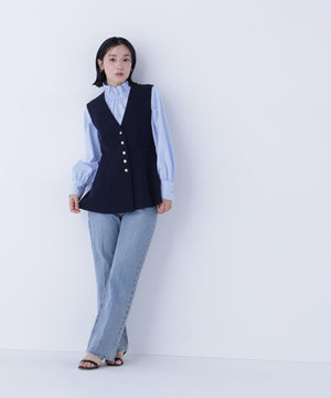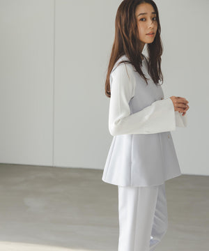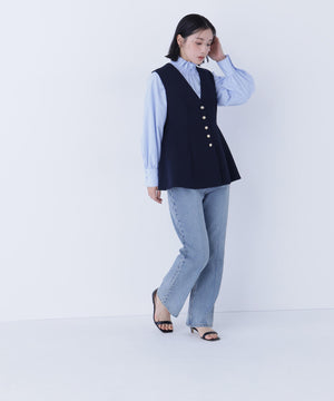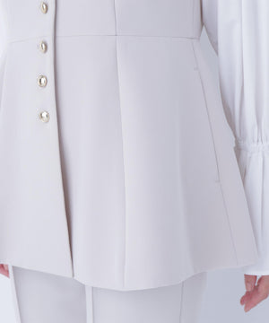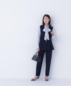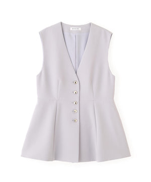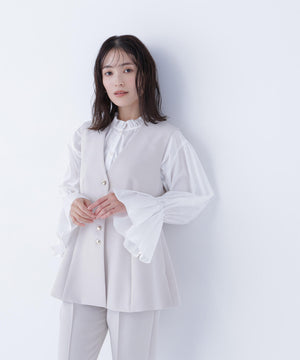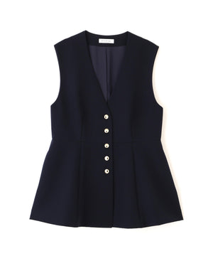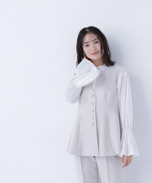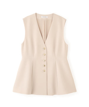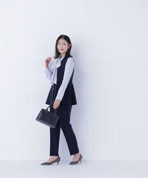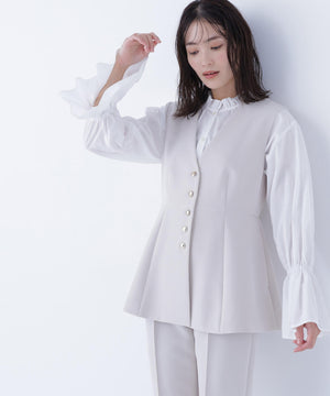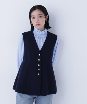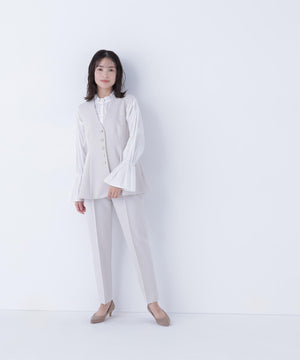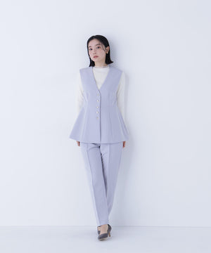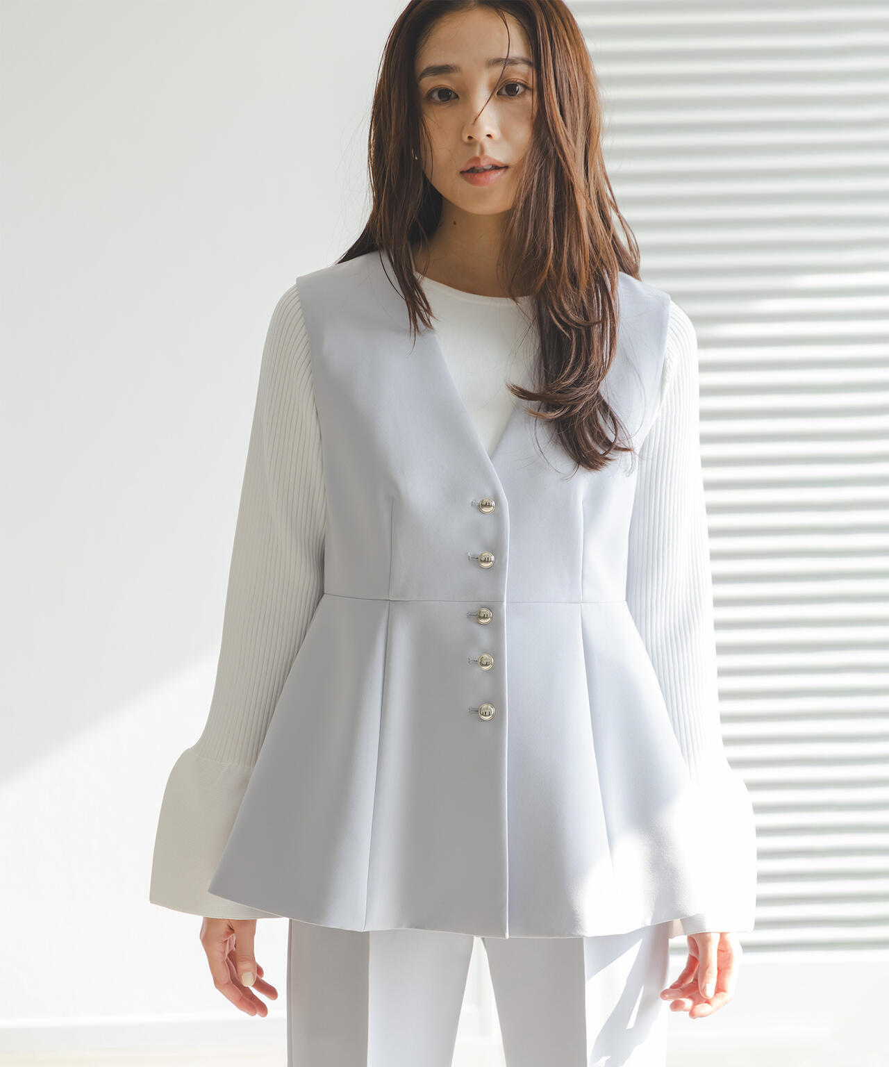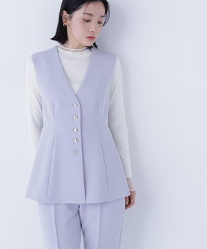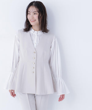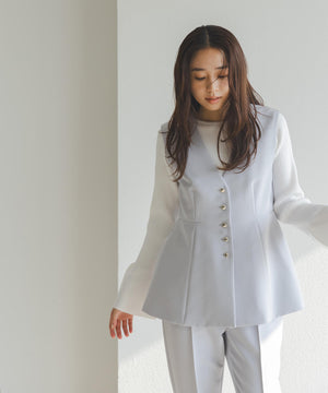 きちんと感のある素材を使用したオケージョンシーズンにぴったりなジレ。ペプラムシルエットが、すっきりと見えるウエストラインを演出してくれます。華やかなゴールドカラー釦がアクセント。キレイめパンツと相性バツグンです。同素材のパンツとのセットアップもおすすめです。