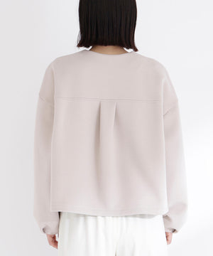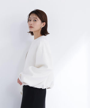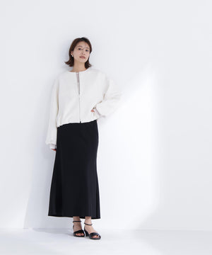 裾はドロスト仕様でシルエットの変化を楽しめるブルゾン。シルバーパーツのファスナーとスピンドルで統一し、洗練された印象に仕上げています。袖口にタックを入れて立体感のあるフォルムを演出。ノーカラーなのでハイネックやシャツ襟とのレイヤードも映えるアウターです。