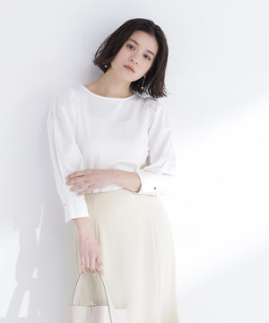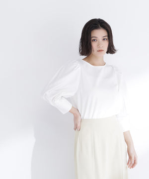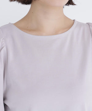 カットソー素材を使用したパフスリーブデザインのトップス。すっきりとしたボートネックに、構築的でフォルム感のあるパフスリーブデザインが特徴です。程よくコンパクトなボディなので、ボトムスにタックインするのがおすすめ。オフィスシーンからデイリーまで着回せます。