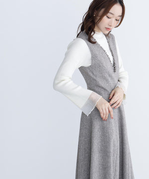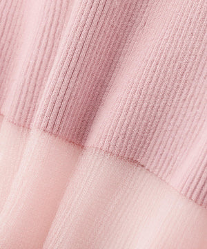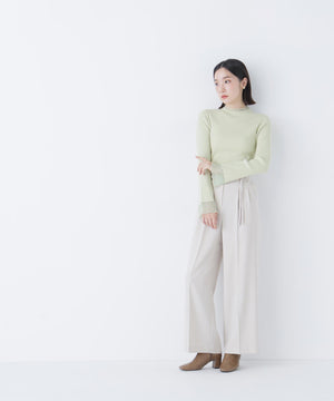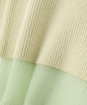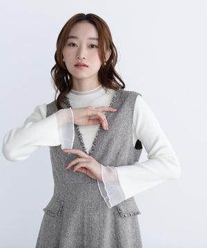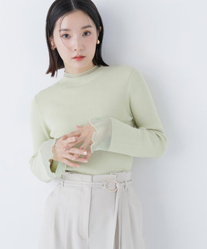 NBB人気のシアーフレアカフスリブニットが再登場!今年は袖口のシアー部分を少し長めに取っており、春らしいシアー感が楽しめます。袖口はフレアデザインにし、袖口と首元は同系色のシアーラインを入れて重くなりすぎないポイントに。ハイゲージのリブニットで華奢見えを叶えます。襟ぐりはモックネックなので一枚着としても、ジャンスカのインナーとしても着回せます。