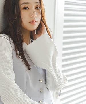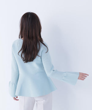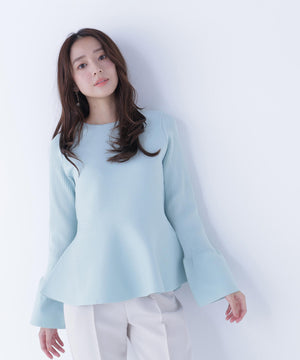編地の変化でフォルムを出し構築的なシルエットが楽しめるニットトップス。横使いをしている編み方のため、通常のニットアイテムよりしっかりとした伸縮性があります。袖口にフォルム感を出したベルスリーブが華やかなデザイン。ペプラムシルエットやボートネックが、女性らしい印象に見せてくれます。