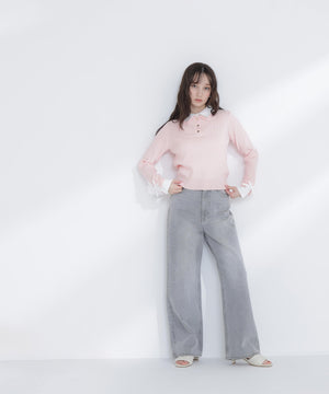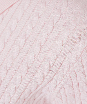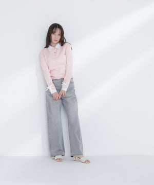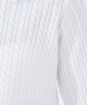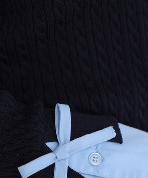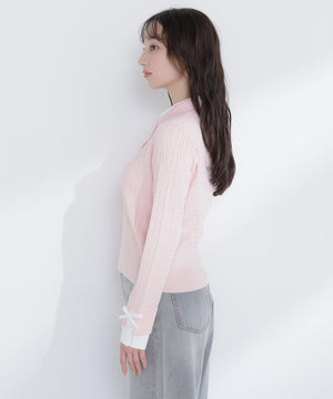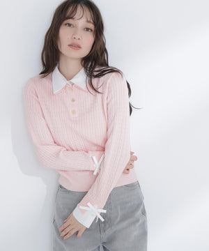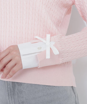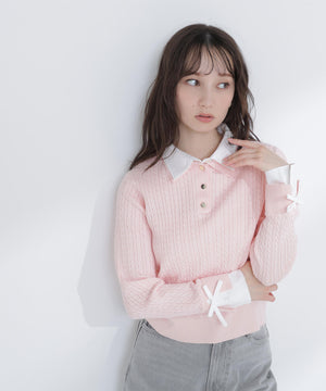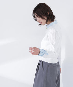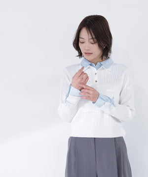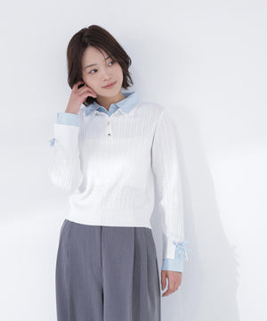 シャツをドッキングしたケーブル編みニット。カフスの華奢なリボンが女性らしいアクセントになり、ダブルカラーのスキッパーデザインで首元に抜け感をプラス。一枚でレイヤード風の着こなしが楽しめます。