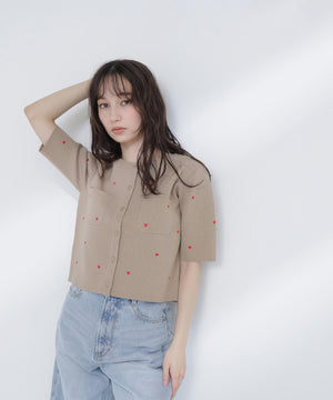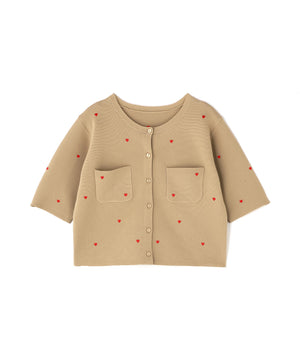 ハート刺しゅうがさりげなく可愛らしいニットカーディガン。ジャケットのようなしっかりとした風合いで、きちんと感のある一枚です。コンパクトなシルエットで、バランスよく着こなせます。