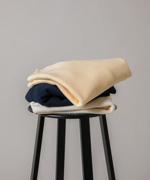 鹿の子編みの立体感ある編地で、程よいハリと柔らかさのある糸を使用しています。