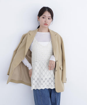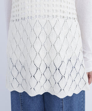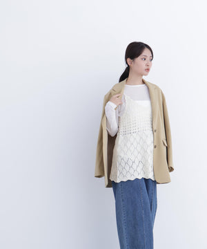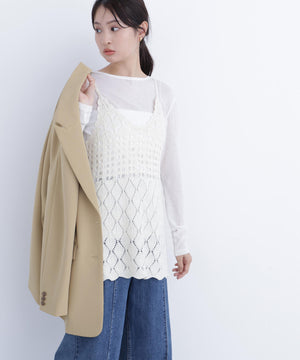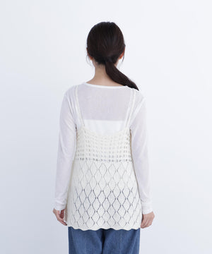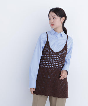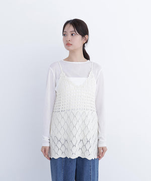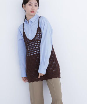 カギ編みで仕立てたキャミソールニット。レイヤード仕様のアイテムで、コーディネートに取り入れると映えるデザインです。軽やかでカジュアルな雰囲気を出しながら、季節のスタイリングに活躍してくれます。