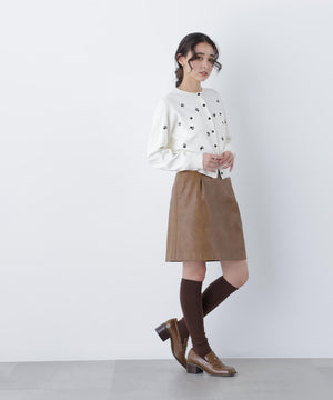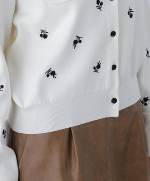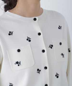 胸元ポケットがポイントのニットカーディガン。トレンドの飛び花柄刺しゅうが今の気分にぴったりなデザインです。配色の黒蝶ボタンもポイント。さらっとしたタッチの糸でロングシーズン着回せます。