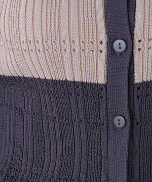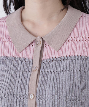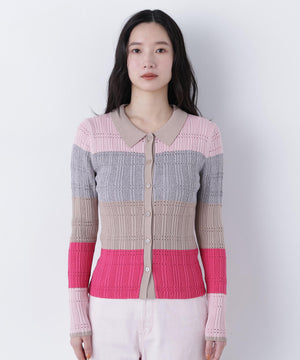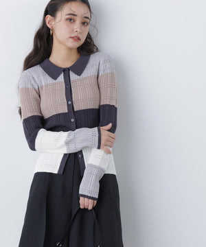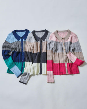 今シーズンらしい襟付きデザインとマルチカラーが新鮮なコンパクトリブニット。変形リブ編みにアイレットを入れ、軽やかで表情のある印象のデザインです。本開きボタン仕様で、プルオーバーとしてもカーディガンとしても着ていただけます。