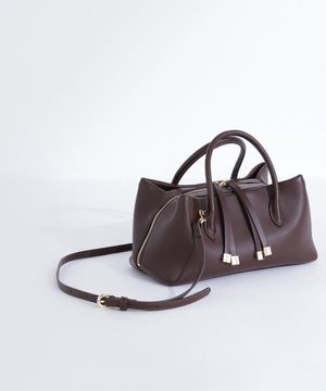 コロンとしたシルエットと折り返しマチがやさしい印象のボストンバッグ。金具感をそぎ落としたデザインで、カジュアルからオフィススタイルまで幅広く活躍してくれます。ダブルファスナーで大きく開くメイン部屋はマチ幅があり、お弁当やボトル類も収納可能。前後のあおりポケットで荷物の仕分けにも便利です。肩掛けとクロスボディ持ちができるショルダーストラップ付きです。