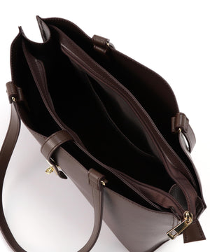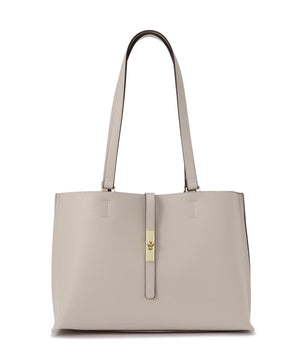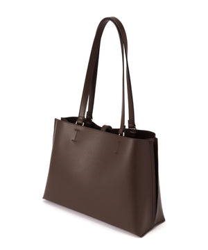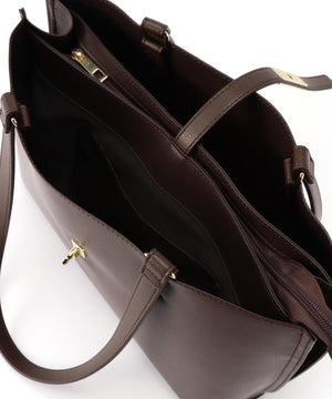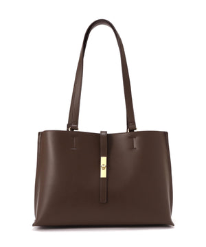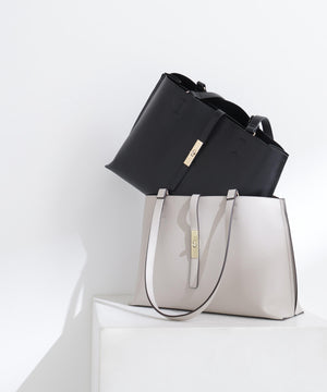 デイリー使いにおすすめの便利なトートバッグは、メタルを効かせたナローベルトがポイント。オフィスへの通勤に頼れる大容量で、14インチのノートパソコンやA4サイズの書類が横ですっぽり入るサイズ感。中は真ん中のファスナー収納を仕切りに3部屋に分けた、実用的なマチ幅もしっかりあるデザインで、中央にはお弁当箱も入る優れものです。表裏Wフェイスのフェイクレザーで仕上げているので軽量&程よいハリ感もあり、少ない荷物でもしっかり自立します。ハンドル部分はアウター着用時でも小脇におさまるショルダーの長さで、ハンドル付け根から外側に倒れるよう可動域をもたせているので、荷物の出し入れがスムーズ♪シーズンレスで活躍するカラー展開です。