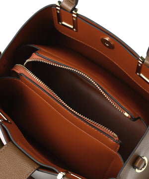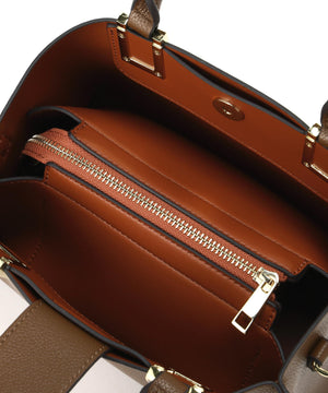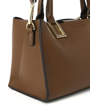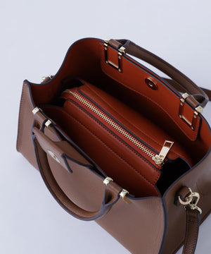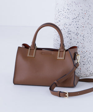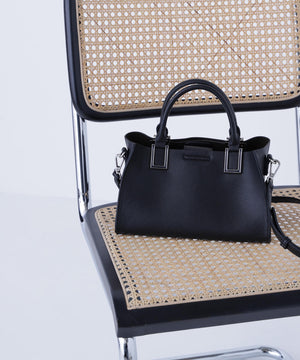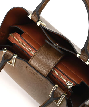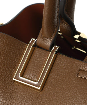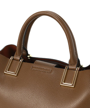 ハンドル付け根のスクエア金具が印象的な横長タイプのトートバッグです。金具はボディと同色の樹脂加工で高級感を演出。ボディはコバ(生地の断面)とインナーカラーを、カラーコンビで仕上げる事でスタイリングのポイントに。本体は3部屋に分かれおり、中央部分はマチもしっかりあるのでランチボックスなどもフラットに収納することが可能です。バックルで長さ調節可能なショルダーストラップ付き。