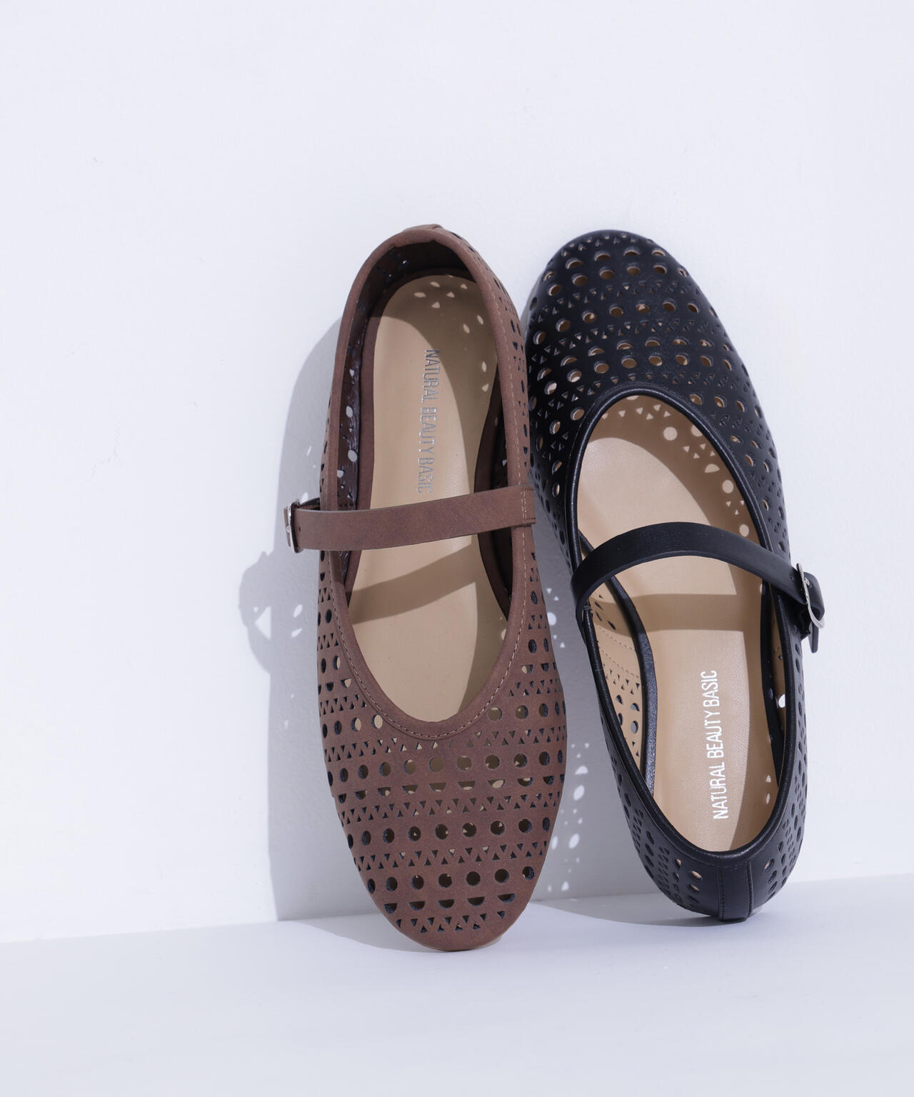 カットワークを施した軽やかなクラフトタッチのメリージェーンバレエシューズ。柔らかな素材を使用しているので足当たりも良く、ストラップのバックル部分は伸縮するゴム仕様で、食い込むことなくストレスフリーなはき心地。デニムスタイルとの相性も良く、コーディネートをアップデートしてくれます。