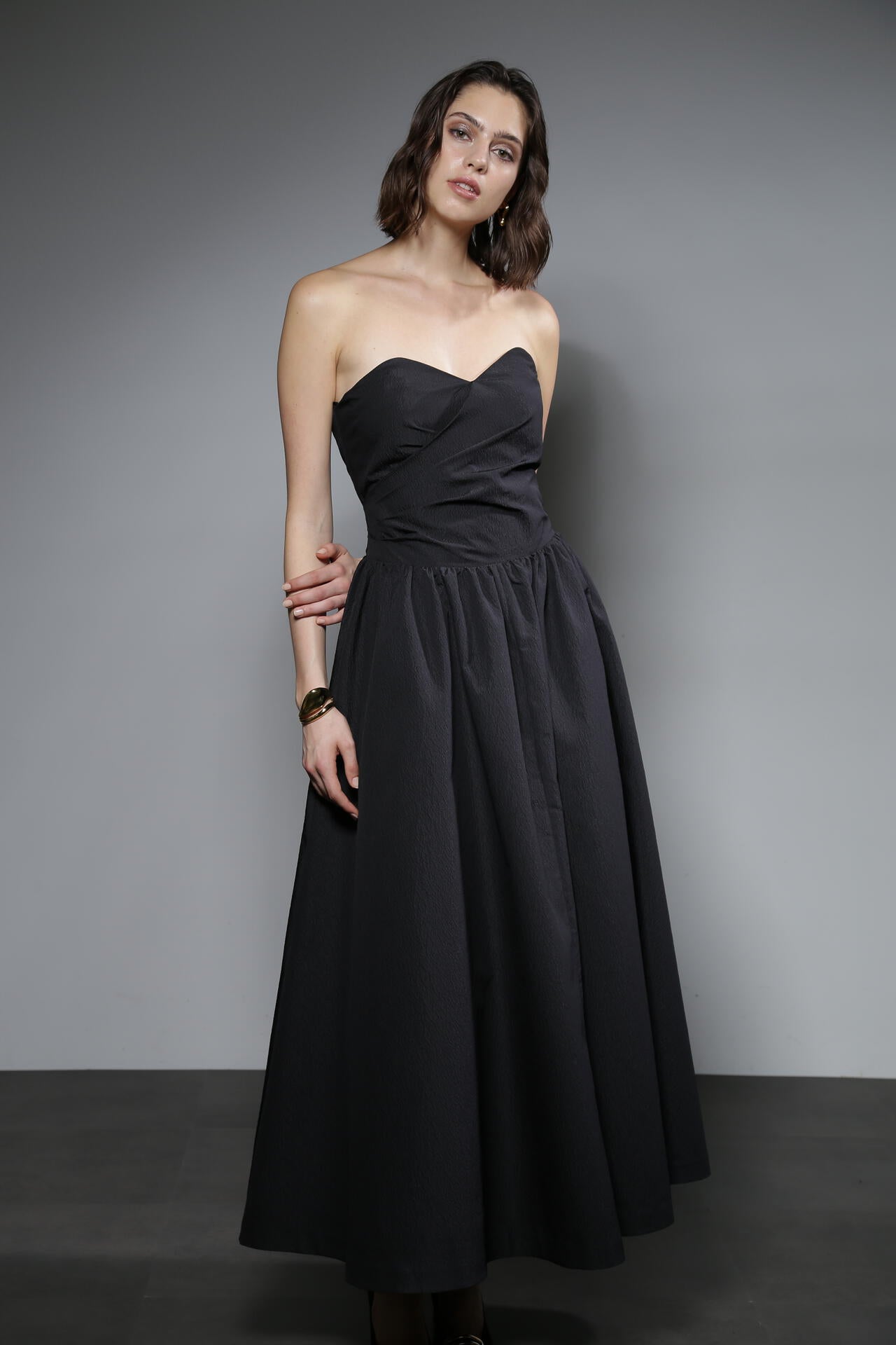 身頃にはボーンが施され、スッキリとしたシルエットを実現。ウエスト周りはタイトなラインで引き締め、ウエストから裾にかけボリュームが広がるドラマティックなシルエットが特徴。インナーにパニエを仕込み、ボリューム感を演出した、一枚で究極の華やかさと気品を纏えるドレスです。