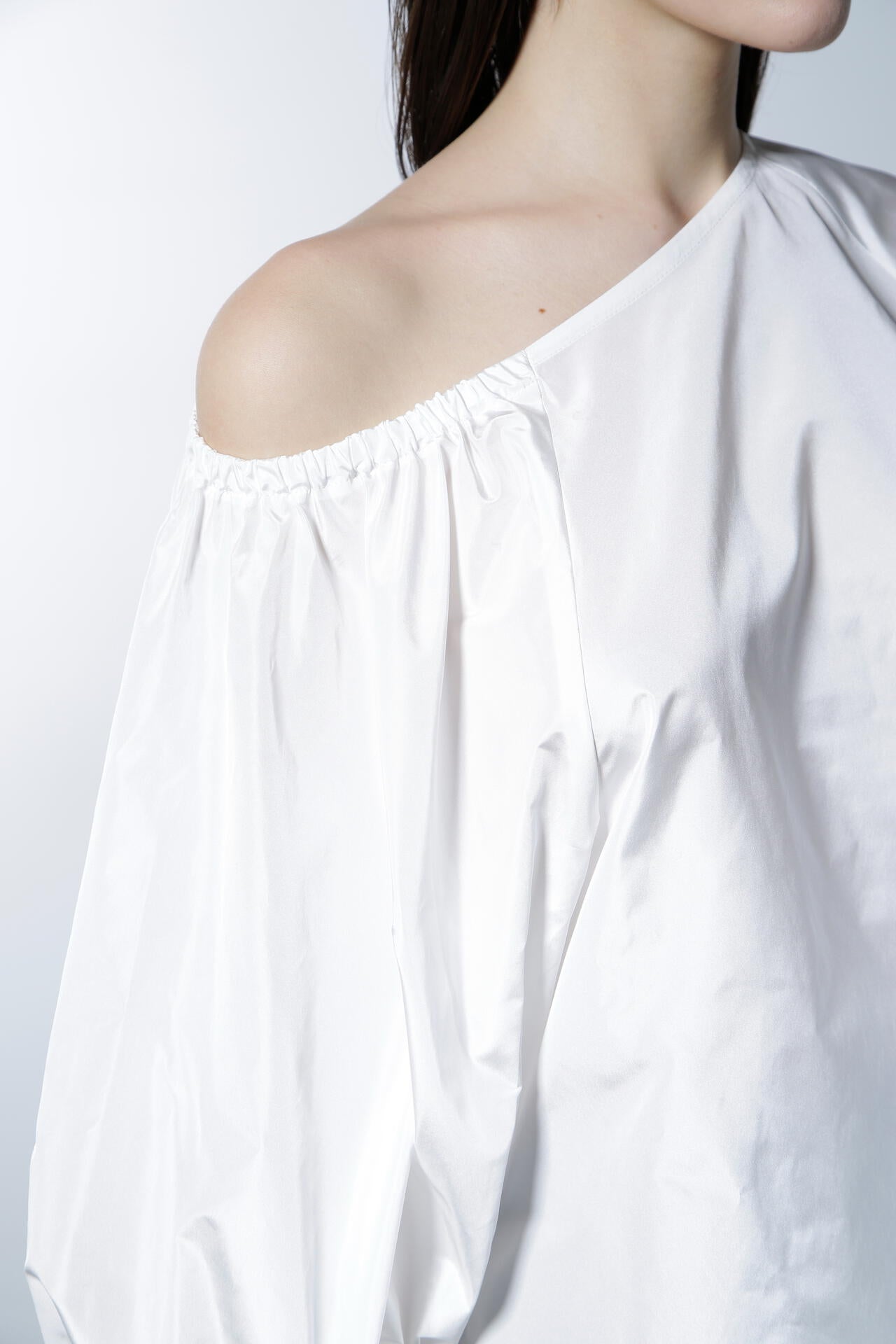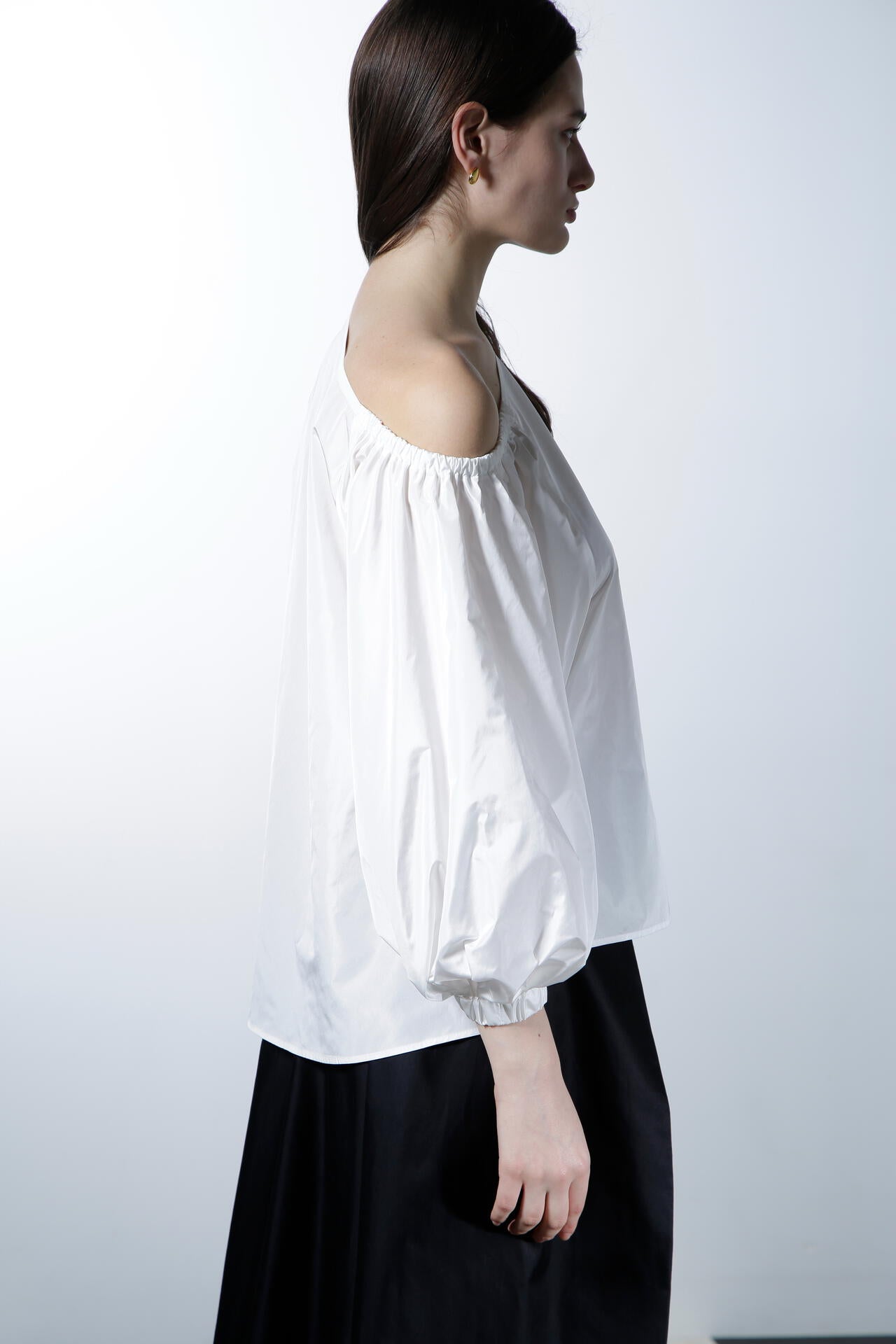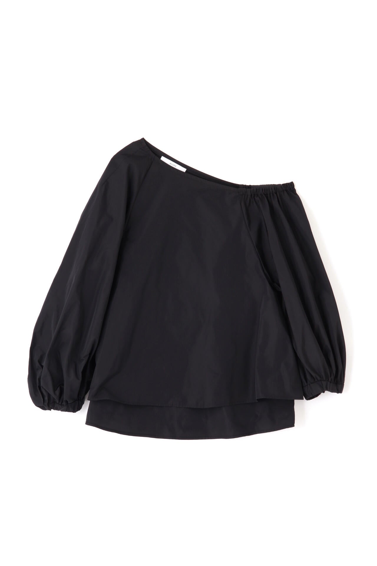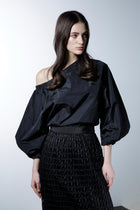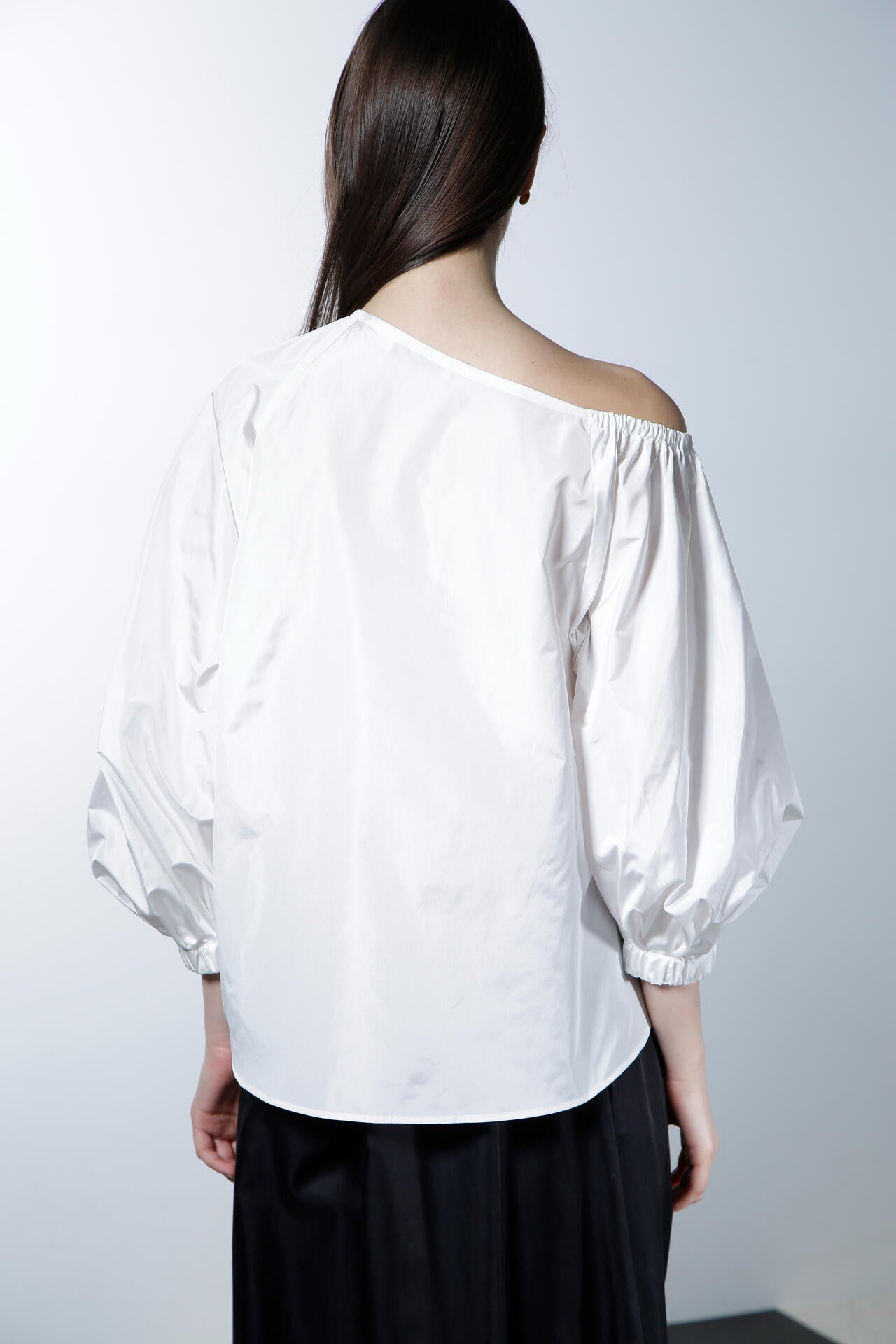 シルクの光沢が上品で華やかな印象を与える、ハリ感のあるタフタ素材のブラウスです。この素材の特性を活かし、ボリューミーなバルーンスリーブで華やかさを際立たせ、印象的なデザインに仕上げています。アシンメトリーなショルダーカットがデコルテラインをすっきりと美しく見せ、シャープでエレガントな雰囲気を一層引き立てます。カジュアルさと洗練さを兼ね備えながらも、華やかなディテールが目を引く、あらゆるシーンで存在感を放つ魅力的なアイテムです。