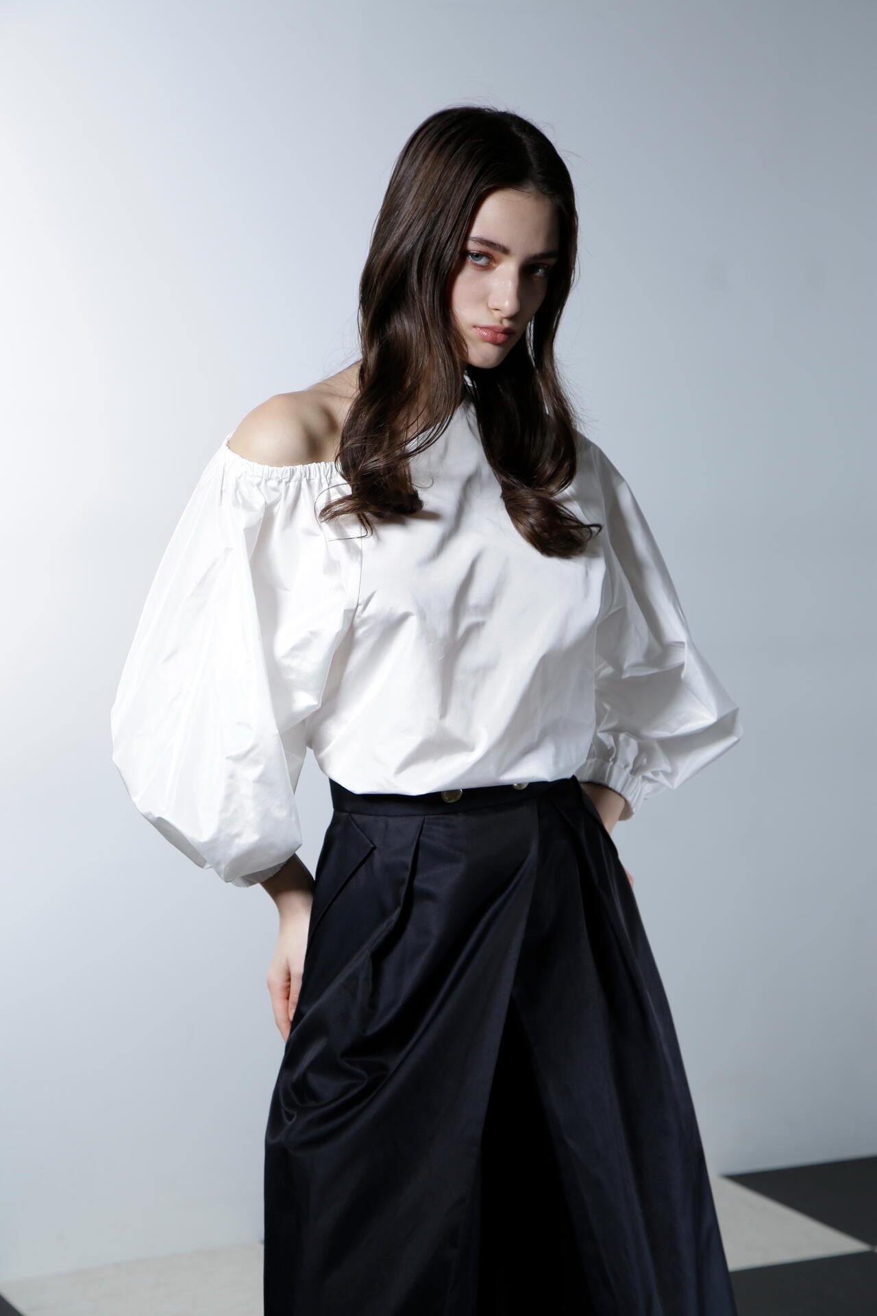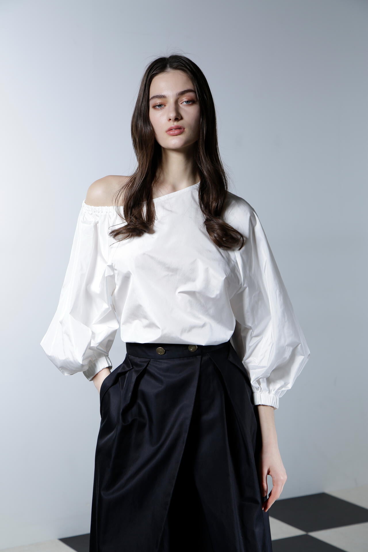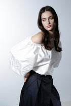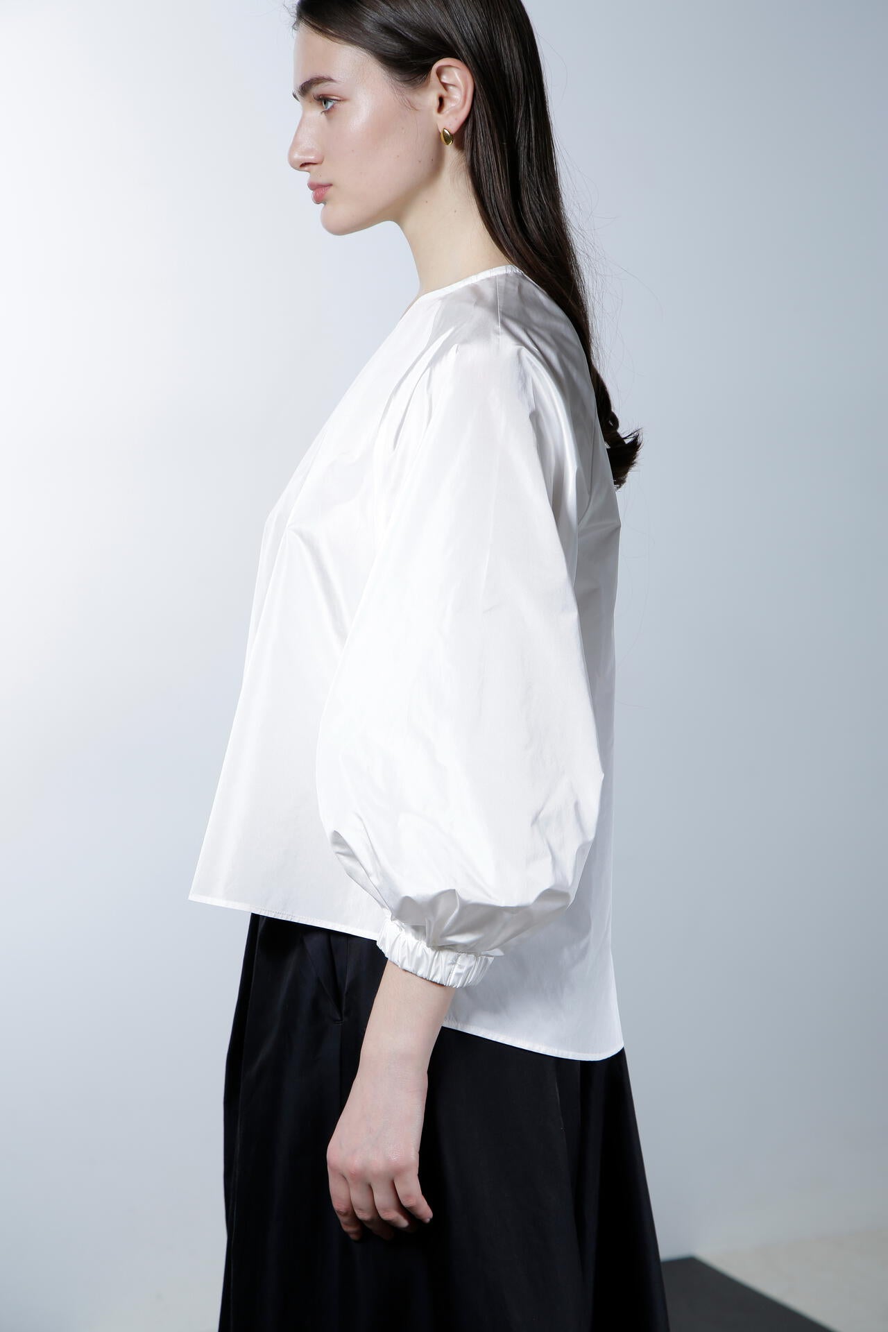シルクの光沢が上品で華やかな印象を与える、ハリ感のあるタフタ素材のブラウスです。この素材の特性を活かし、ボリューミーなバルーンスリーブで華やかさを際立たせ、印象的なデザインに仕上げています。アシンメトリーなショルダーカットがデコルテラインをすっきりと美しく見せ、シャープでエレガントな雰囲気を一層引き立てます。カジュアルさと洗練さを兼ね備えながらも、華やかなディテールが目を引く、あらゆるシーンで存在感を放つ魅力的なアイテムです。