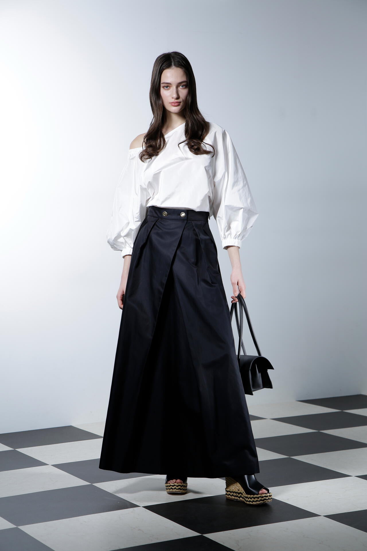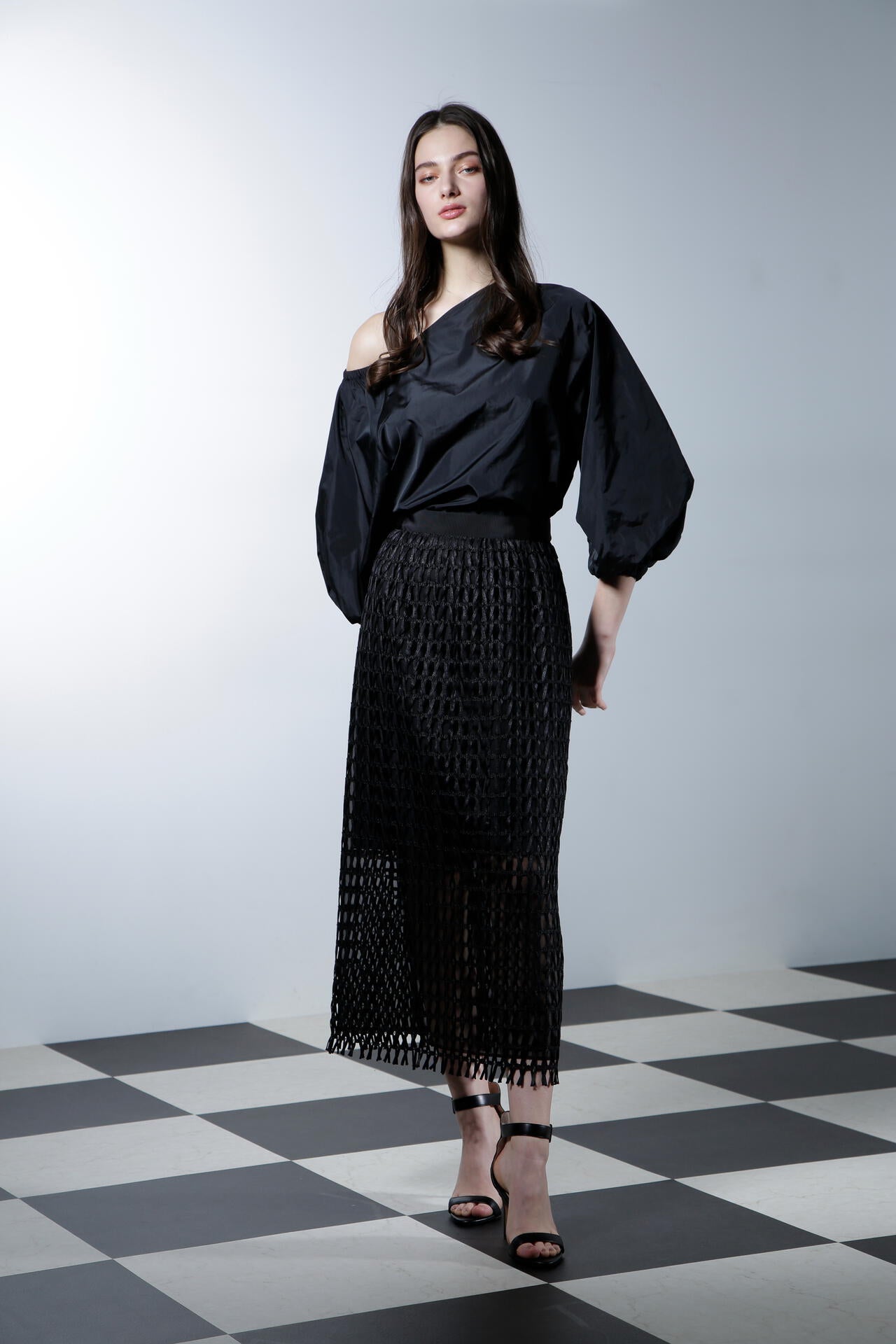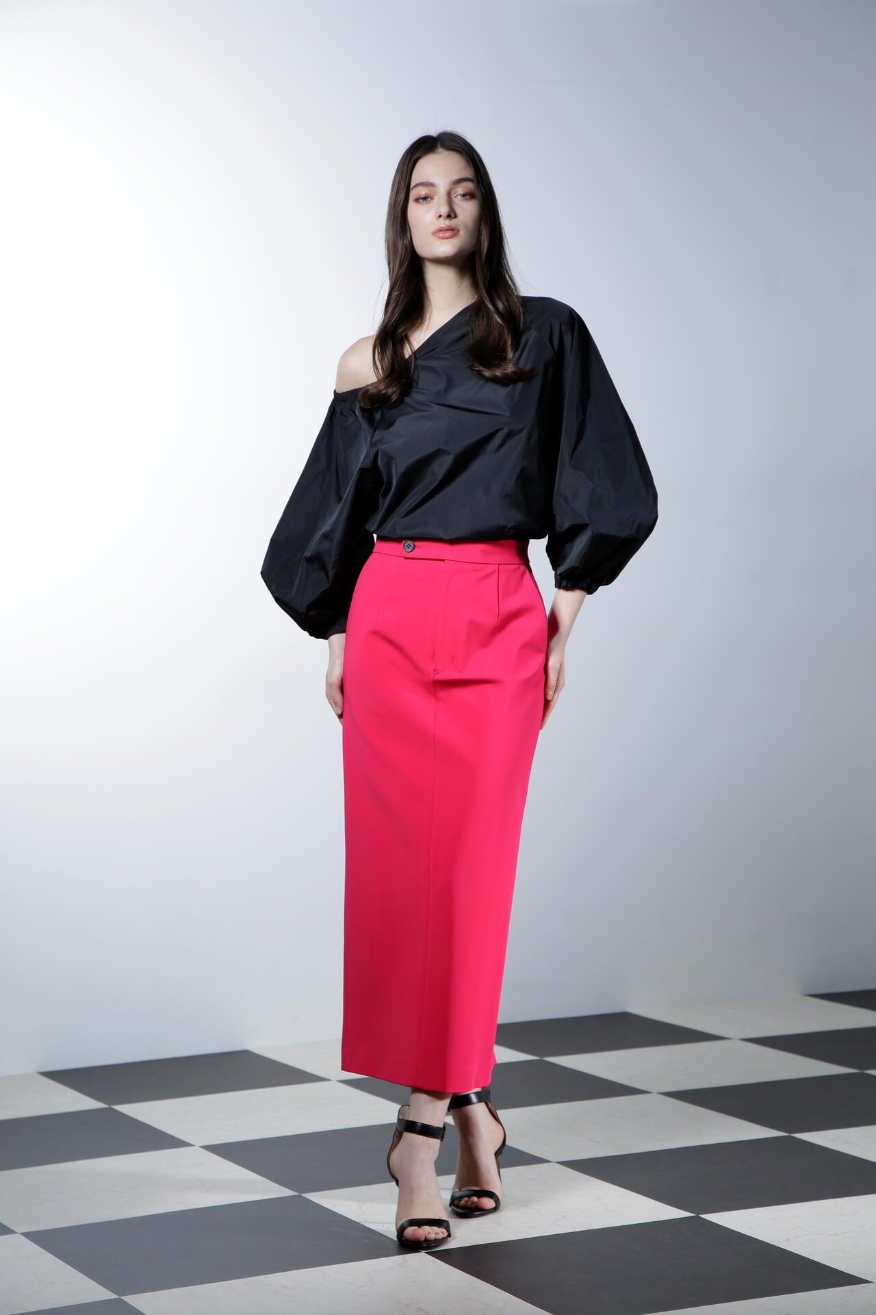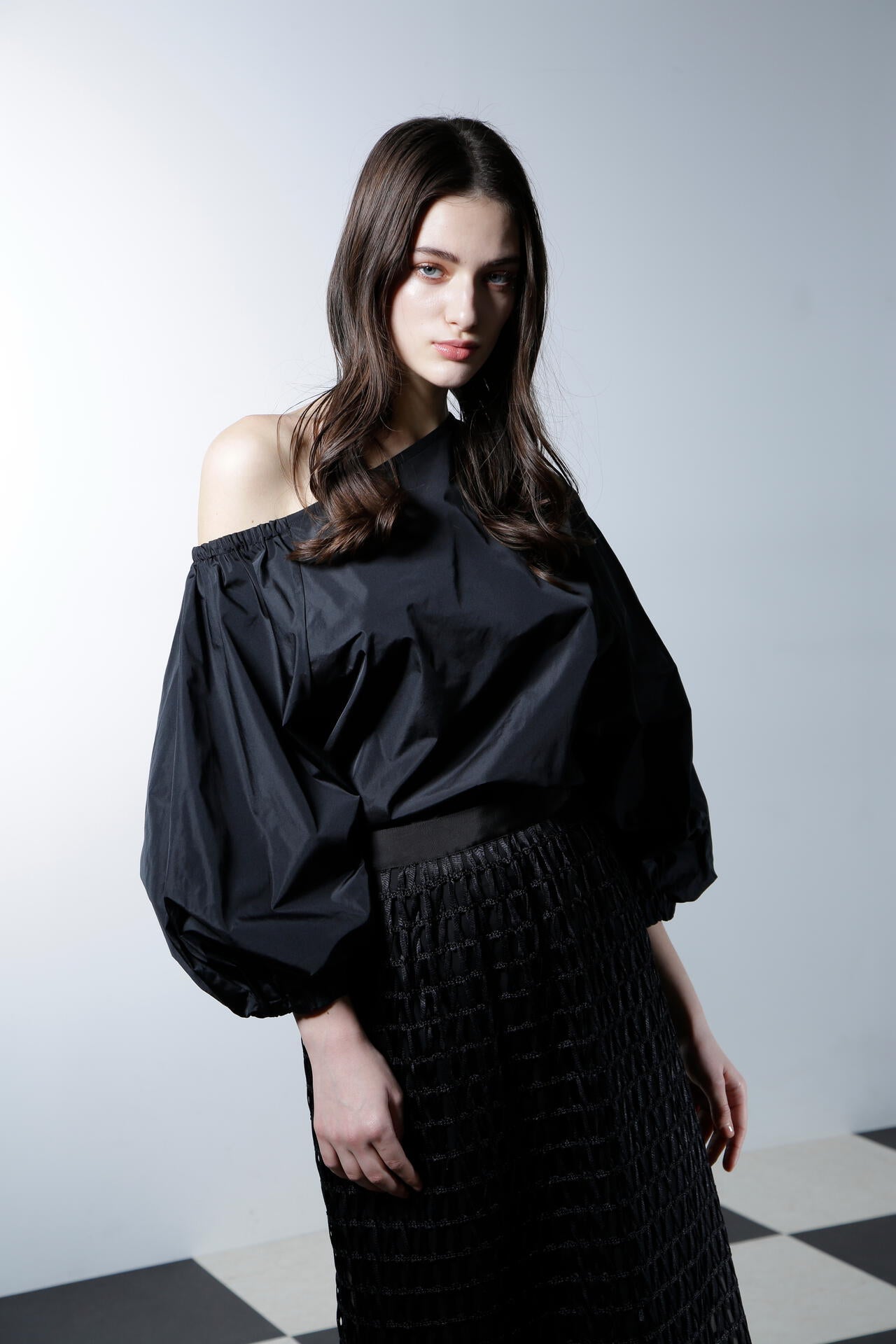 シルクの光沢が上品で華やかな印象を与える、ハリ感のあるタフタ素材のブラウスです。この素材の特性を活かし、ボリューミーなバルーンスリーブで華やかさを際立たせ、印象的なデザインに仕上げています。アシンメトリーなショルダーカットがデコルテラインをすっきりと美しく見せ、シャープでエレガントな雰囲気を一層引き立てます。カジュアルさと洗練さを兼ね備えながらも、華やかなディテールが目を引く、あらゆるシーンで存在感を放つ魅力的なアイテムです。