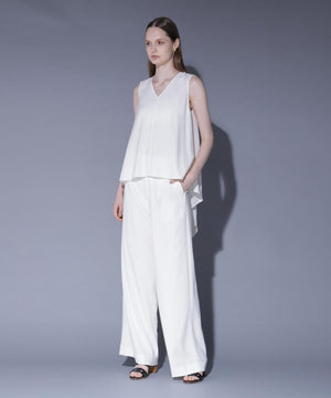 上質な素材を使用したセットアップブラウス。シンプルでありながら洗練されたフロントデザインが魅力です。深めにカットされたV襟が上品で洗練された印象を与え、後ろ身頃のスリットが軽やかでこなれた雰囲気を演出します。シャープなカッティングから広がる大胆なラッフルデザインは、華やかさを引き立て、目を惹くアクセントに。華やかなシーンにぴったりで、同素材のワイドパンツと合わせたセットアップスタイルもおすすめです。