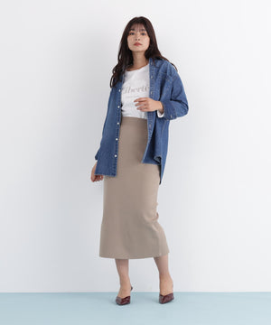 コンパクトにまとめたニットタイトスカートは、大き目なメタル釦がデザインポイント。セットアップとしても、単品使いも便利に使えるアイテムです。ウエストはゴム仕様になっているので着心地も快適です。程良く肉厚な素材は脚のラインを拾わず、安心感があります。後ろに入ったスリットで足さばきもスムーズです。